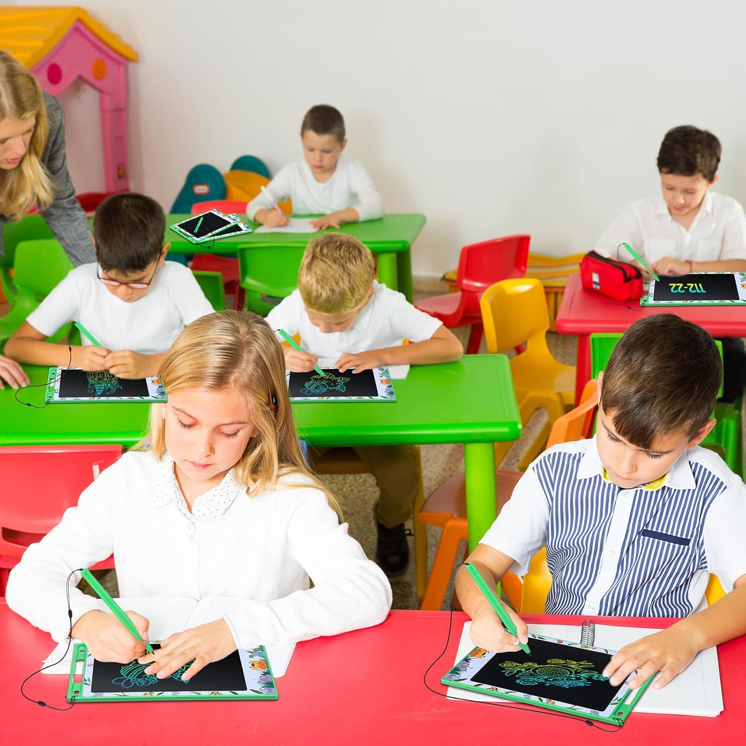 - Easy to use: This electronic writing tablet is designed with pressure-sensitive technology, and each drawing tablet has a built-in battery, making it easy to draw lines; Just press the instant clear button to easily erase and start over, pick up the included pen and create anything you want, and the lock switch on the back prevents your work from being accidentally erased