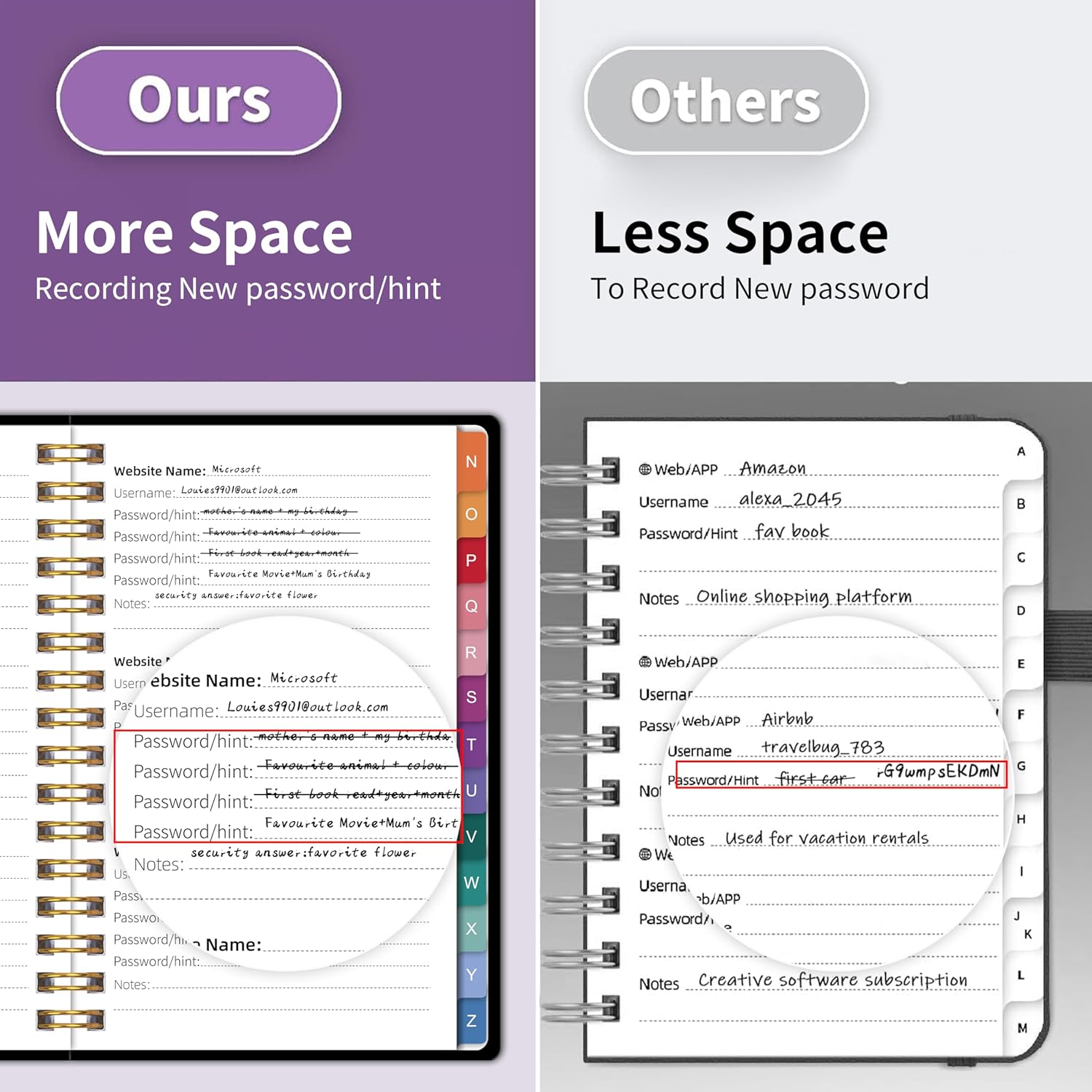- Sturdy Spiral Password Notebook with Ample Writing Space: Built with a durable spiral binding and 100GSM thick pages, this password notebook lays flat for easy writing. Each page provides generous space for usernames, passwords, and hints. The "hints" design can better keep your password confidential and prevent it from being leaked