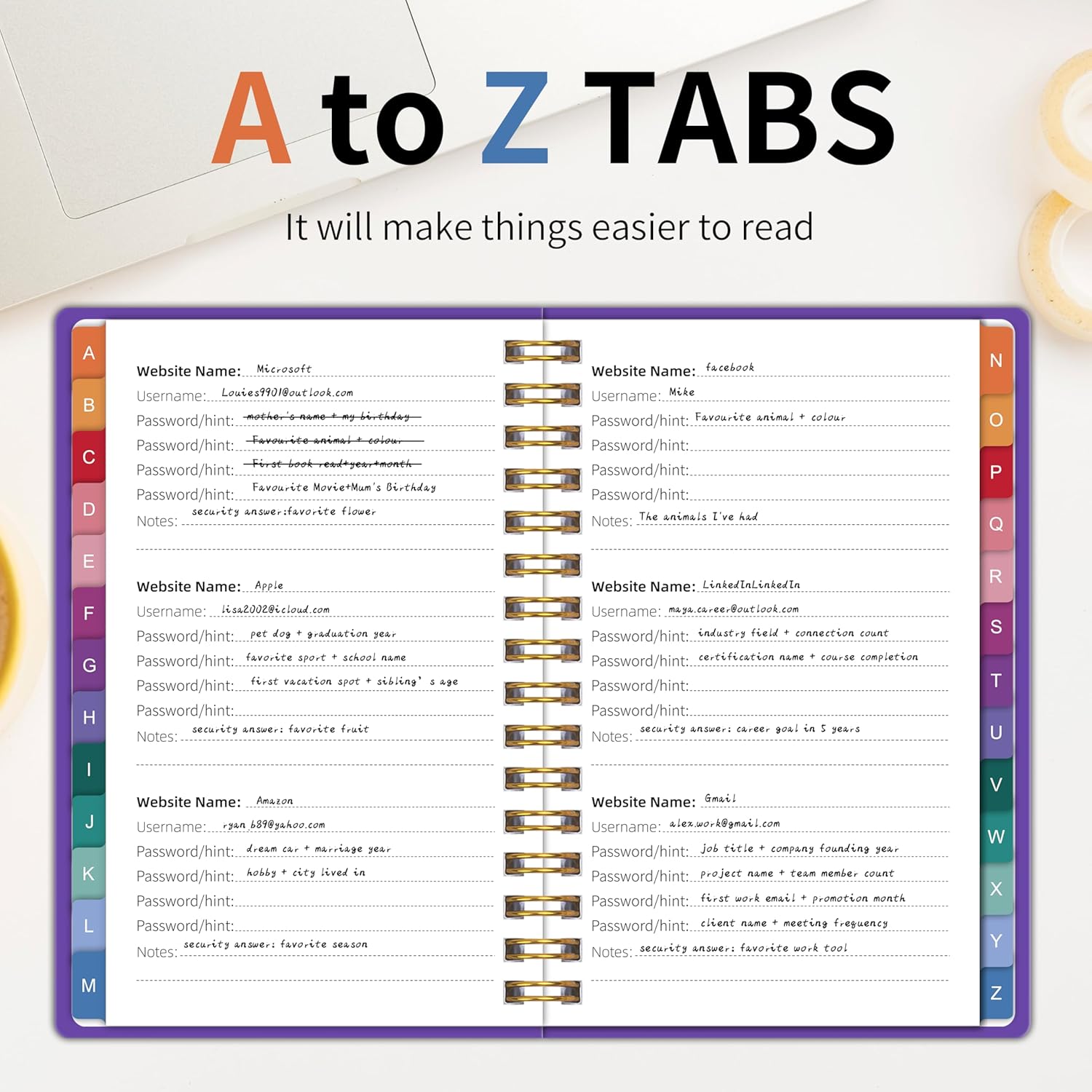 - Sturdy Spiral Password Notebook with Ample Writing Space: Built with a durable spiral binding and 100GSM thick pages, this password notebook lays flat for easy writing. Each page provides generous space for usernames, passwords, and hints. The "hints" design can better keep your password confidential and prevent it from being leaked