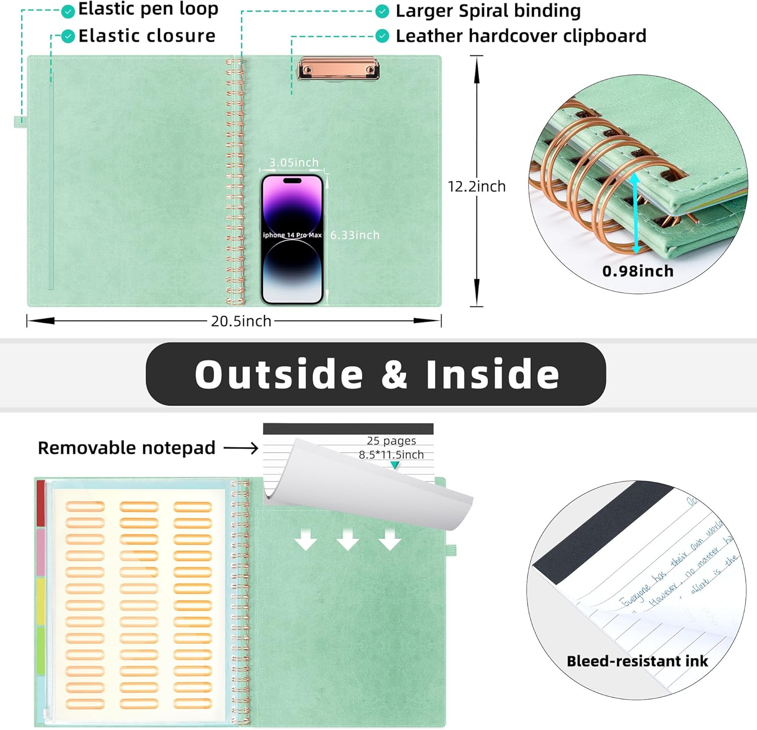 - 【powerful functions】Low-profile clip arc design make it easy gripping and extraction paper, holds up to 80-100 sheets paper. Clip board has a Hidden retractable hanging hole on the top, Easy to hang. Pen Loop for quick, easy storage. Double-loop Metal Spiral have the ability to flip the cover to the backside and use it like a clipboard, no creases and cracks to offer durability. Elastic closure, The elastic band keeps the portfolio closed and prevents contents from getting damaged.