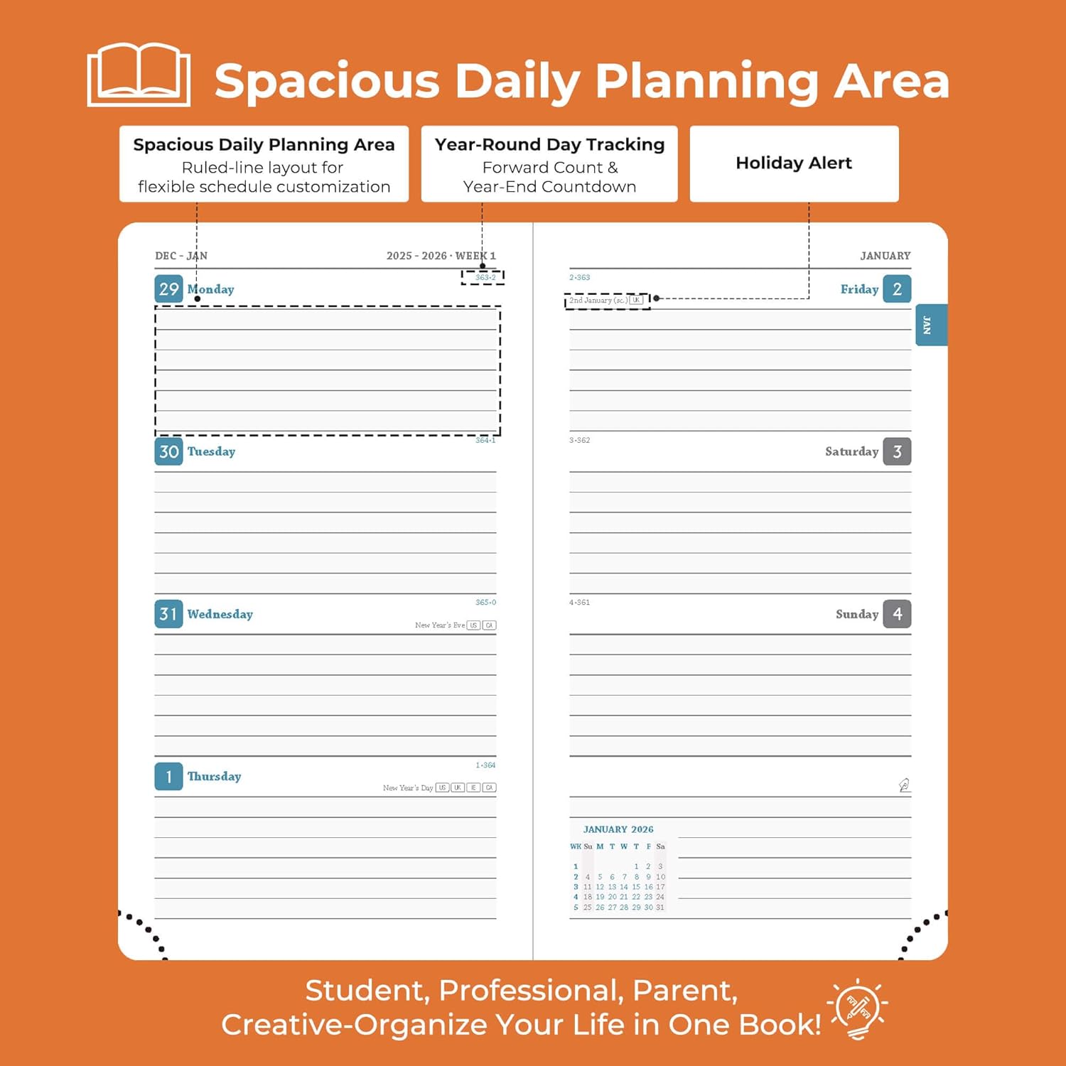 - Professional Grade Material for Your Daily Planner: Crafted with FSC 100GSM thick paper, this 2026 planner ensures good writing with markers while gentle on your eyes through its ivory white pages. The leather soft cover and lay flat binding make it a calendar planner companion for busy professionals, students, and families