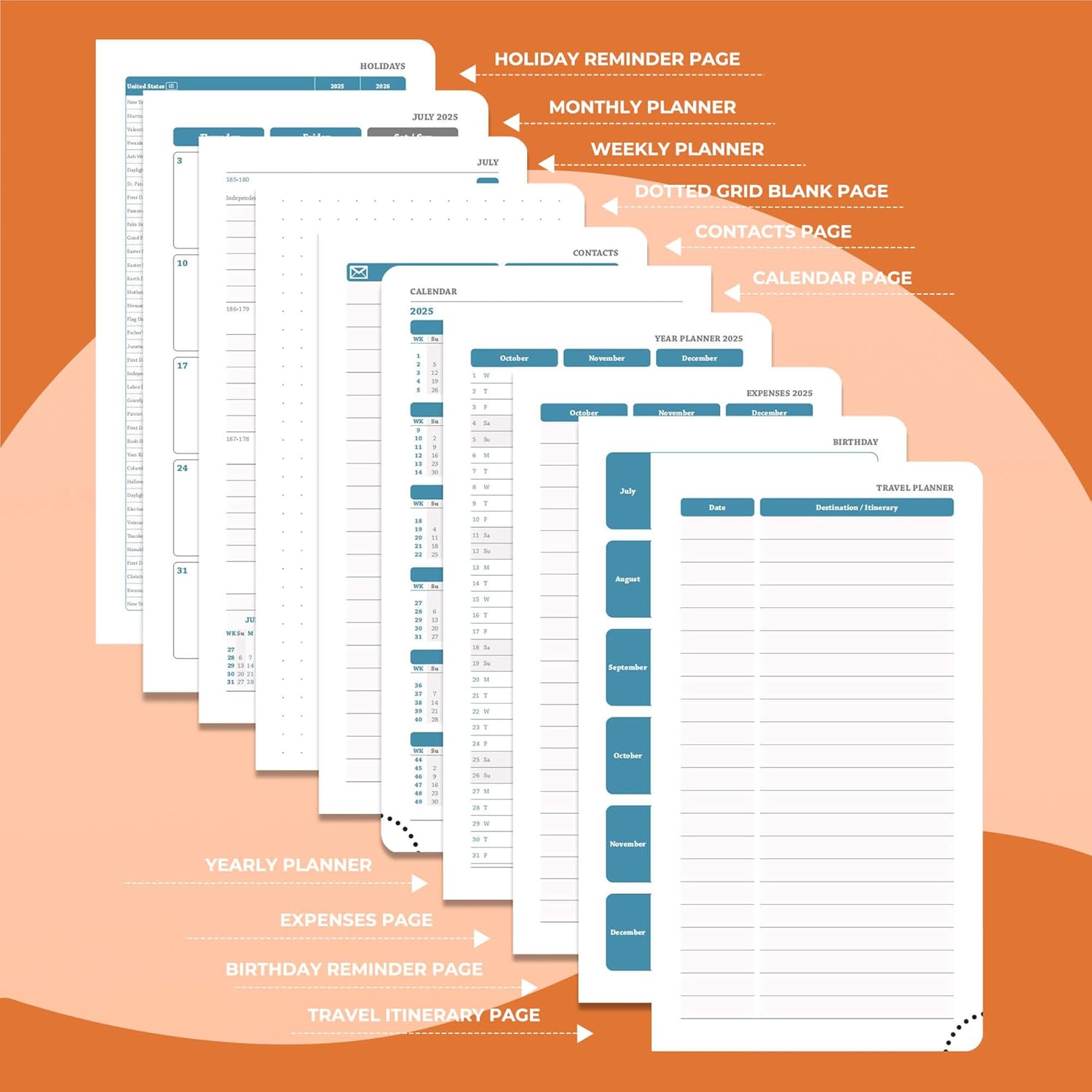 - Multi function Page: Personalized planner system. Year plan pages, holiday reminders, birthday record area for relatives and friends; set up storage contacts, and record inspiration and plans with the dot matrix note area; at the same time, work planner can travel planning and expense management modules to achieve coordination of schedule and finance
