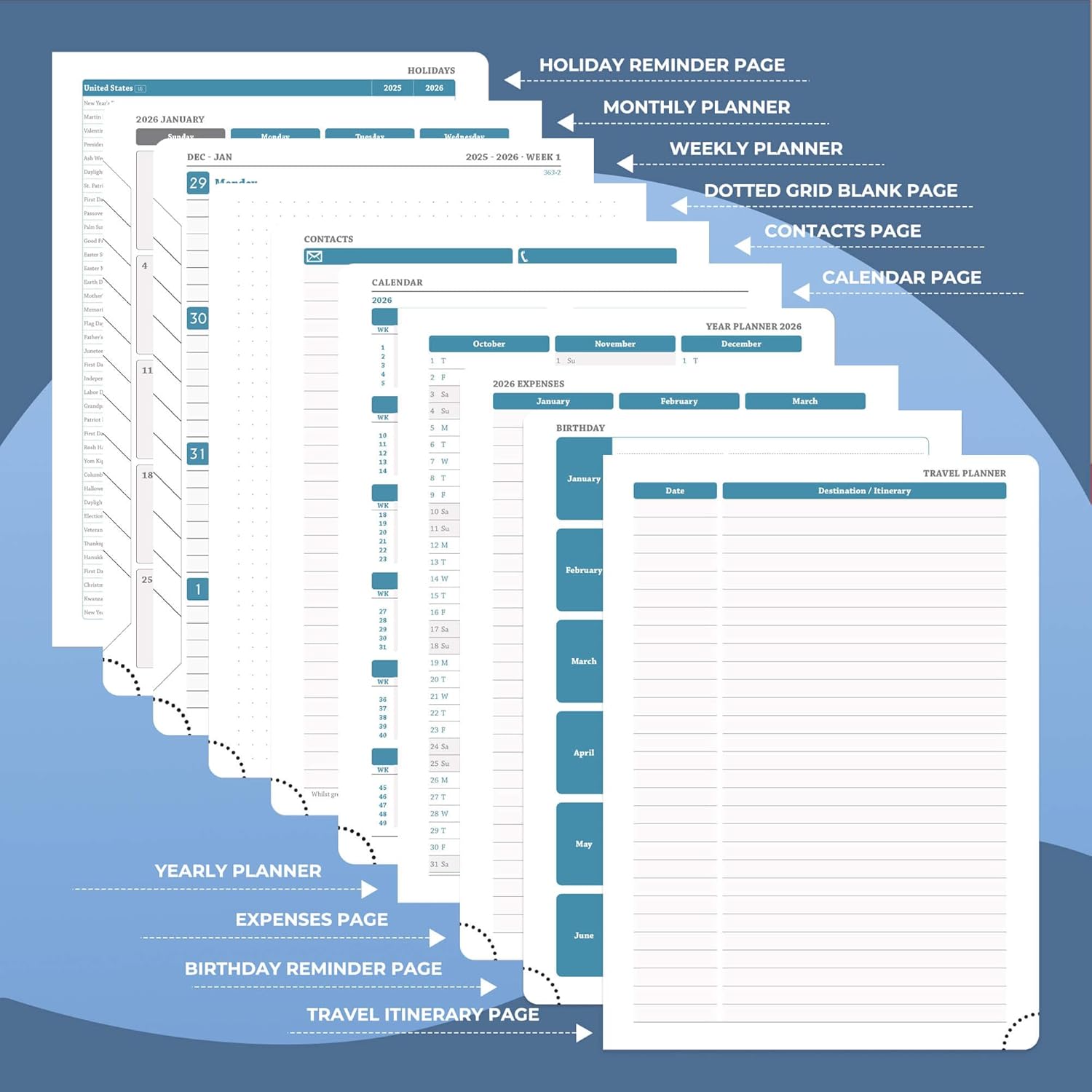 - Universal Design Planner: Suitable for a variety of people and scenarios. Professionals manage project progress, meeting arrangements and goals; student planner 2026 courses, exams and extracurricular activities; home users arrange travel, activitie
