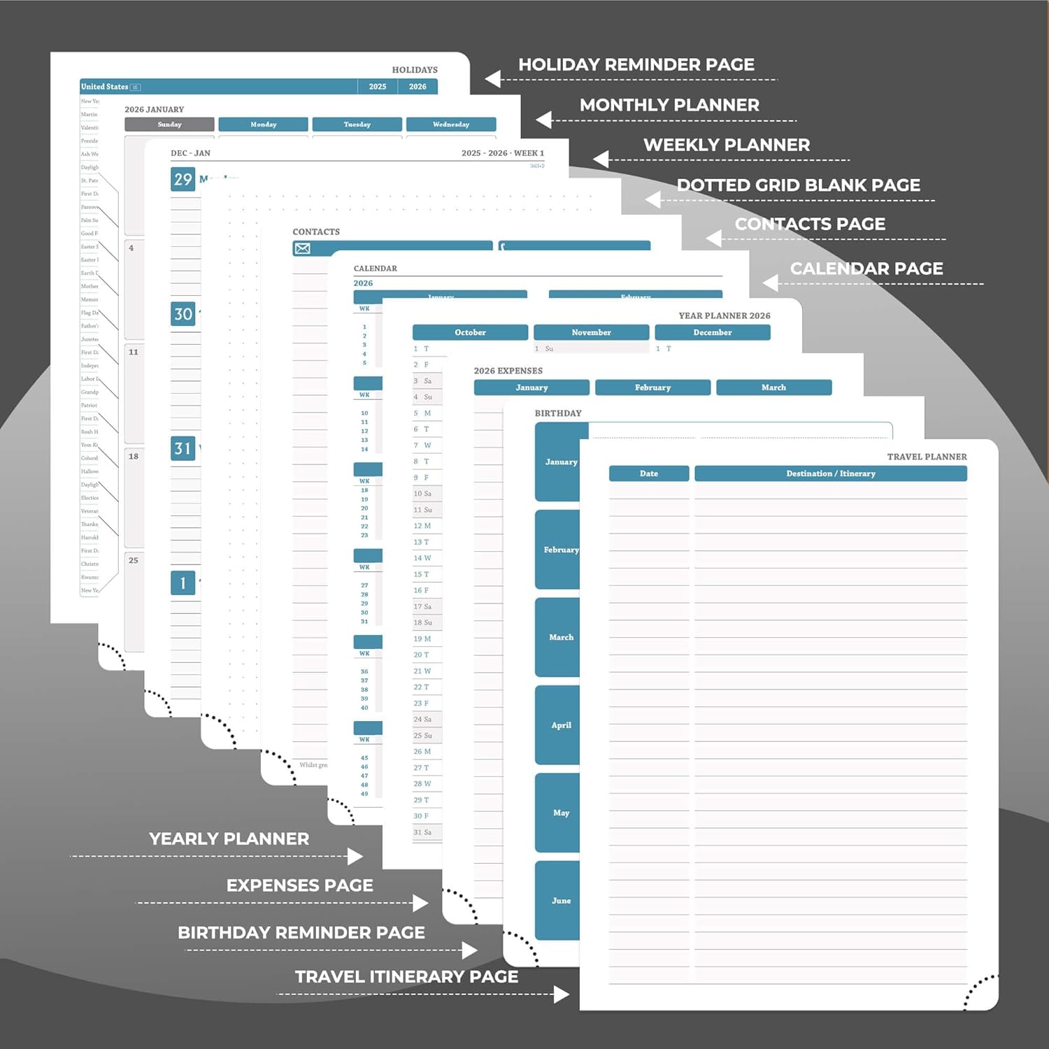 - Universal Design Planner: Suitable for a variety of people and scenarios. Professionals manage project progress, meeting arrangements and goals; student planner 2026 courses, exams and extracurricular activities; home users arrange travel, activitie