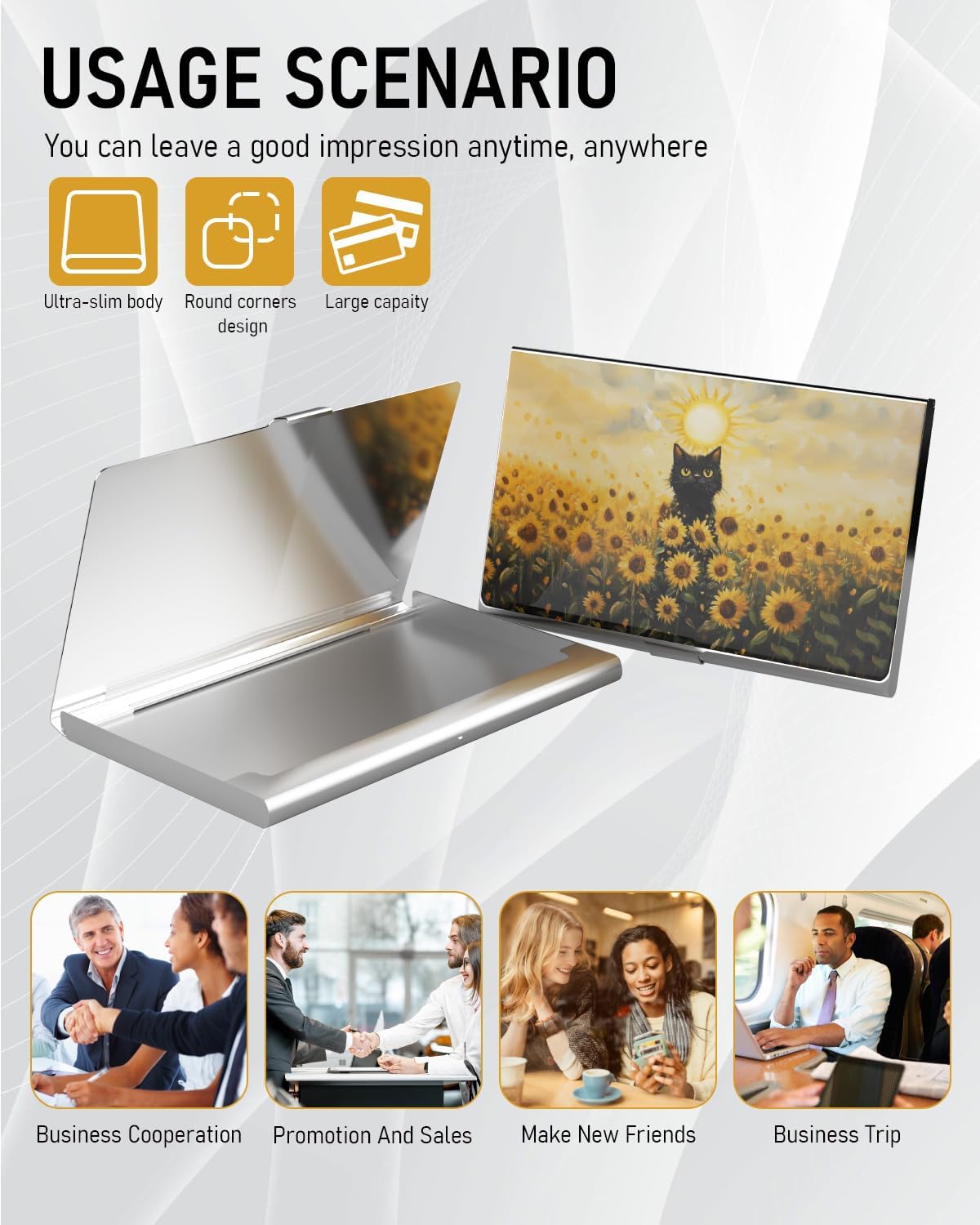 Business Card Metal Slim Organizer, Professional Stainless Steel Square Pocket Wallet for Office Workers, Compact and Portable for Pockets (Sunflower Cat A)