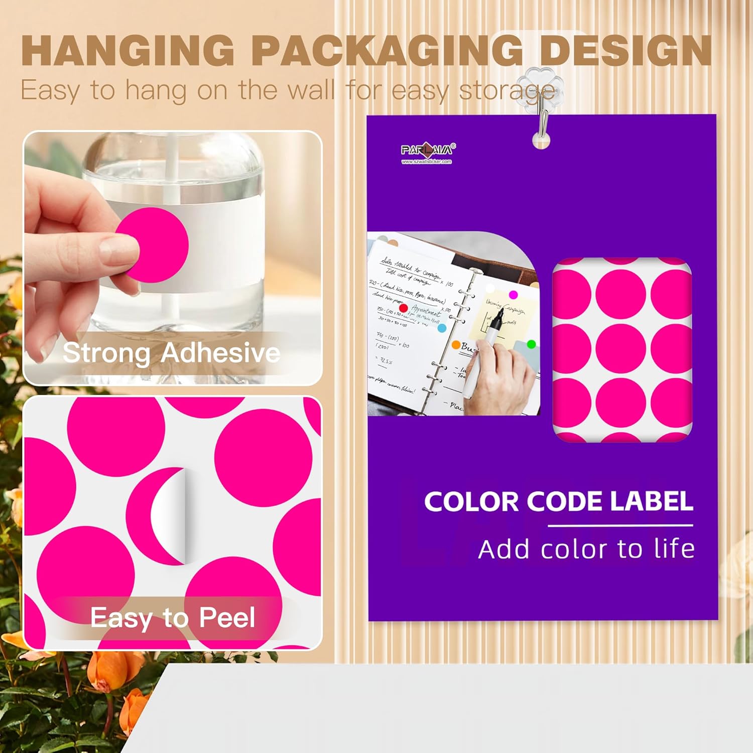 - Cardboard package: 15 sheets 1 inch fluorescent pink dot stickers, total 720 pcs round color-code circle label, package size 266mm*185mm