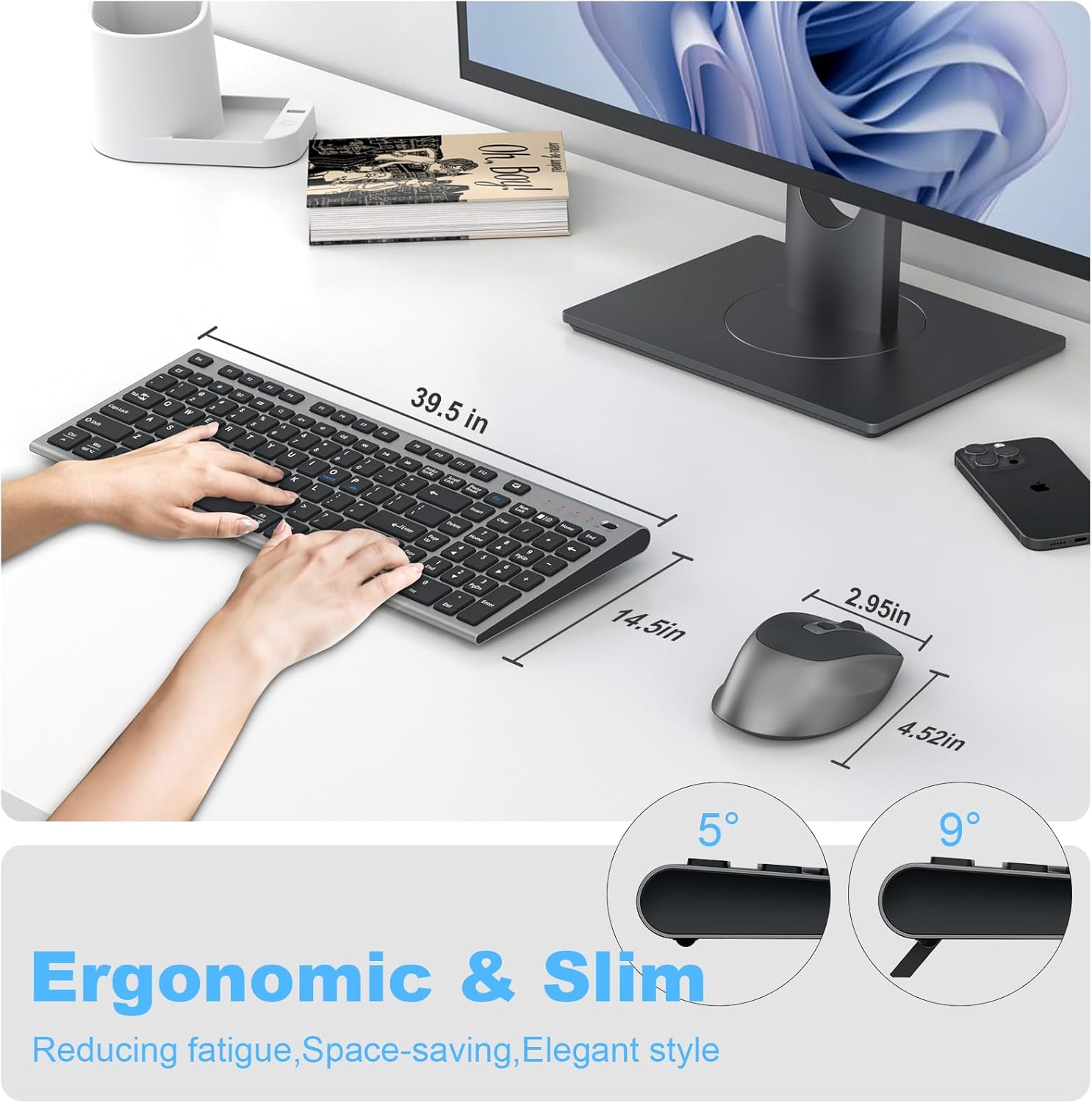 - 【Ergonomics Design】: The key board tilt is adjustable, Effectively reduces hand fatigue.50-60g X-shaped structure keys, Achieve ultra-short stroke fast click and smooth typing experience. The concave surface of the keys makes it more comfortable for your fingers. The surface power switch and numeric keypad make operation efficient and convenient.Independent multimedia shortcut keys, Fully release the F1-F12 keys. 121-key compact layout, with full-size keyboard functions, while saving 10% of space, Achieve shorter and more convenient use distance, freeing up more desktop space.The mouse is of moderate size.Its unique contour and curve design make it more comfortable for you to use.