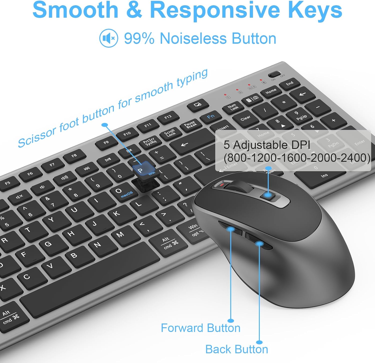 - 【Low Profile and Mute】: The keyboard adopts the X-frame design of the laptop keyboards. Bring an excellent low noise experience. The soft silicone shell not only protects the keyboard from water and dust, but also minimizes noise. The left and right buttons of the mice adopt excellent low decibel light click buttons. This design greatly reduces the noise of mouse use. Suitable for office, home, coffee shop, meeting room, school, and other occasions.