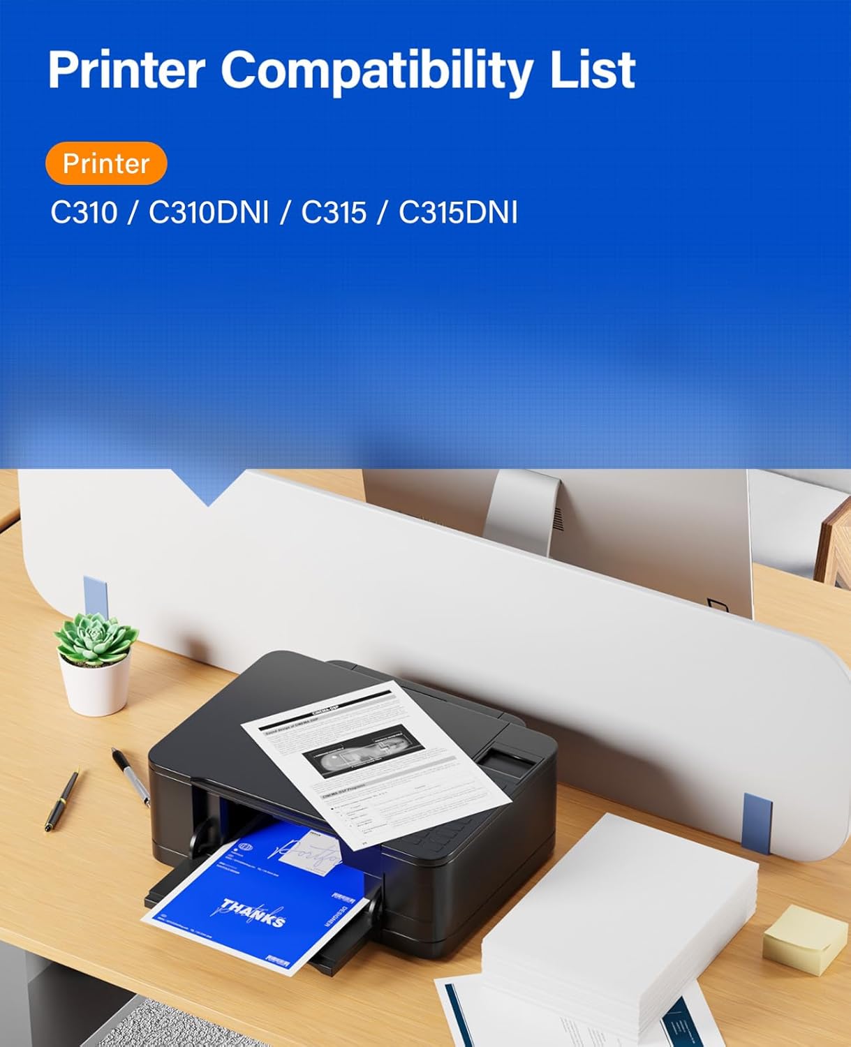 - Yield & Version: 8,000 pages per C310 C315 Black Toner Cartridge and 5,500 pages per C310 C315 Color Toner Cartridge(at 5% Coverage). High Yield Version C310 C315 toner cartridges.