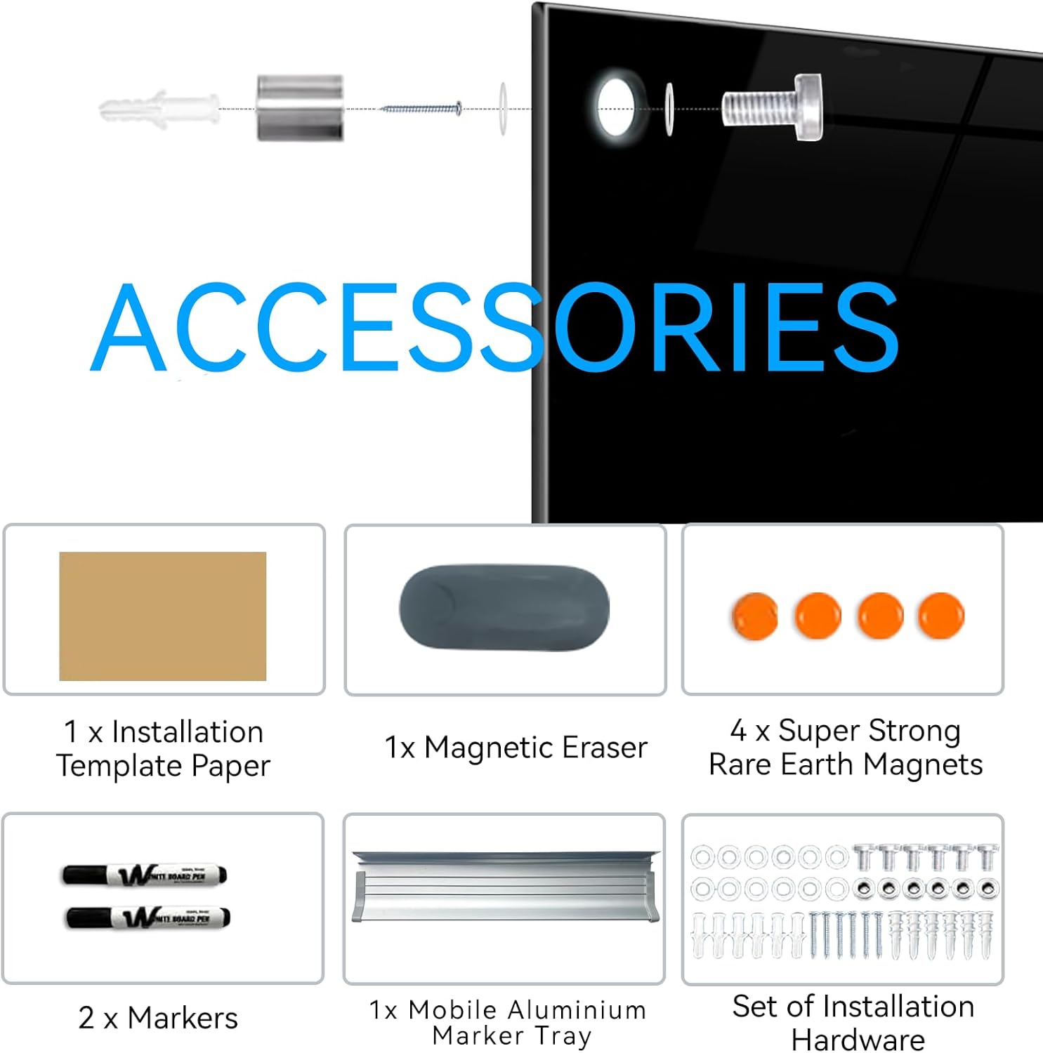 - Modern Frameless Design: Frameless glass black board enhance your space and blend perfectly with any modern decor. You get more writing space—no more hard-to-reach corners! making it a fashionable focal point for your home, office or classroom