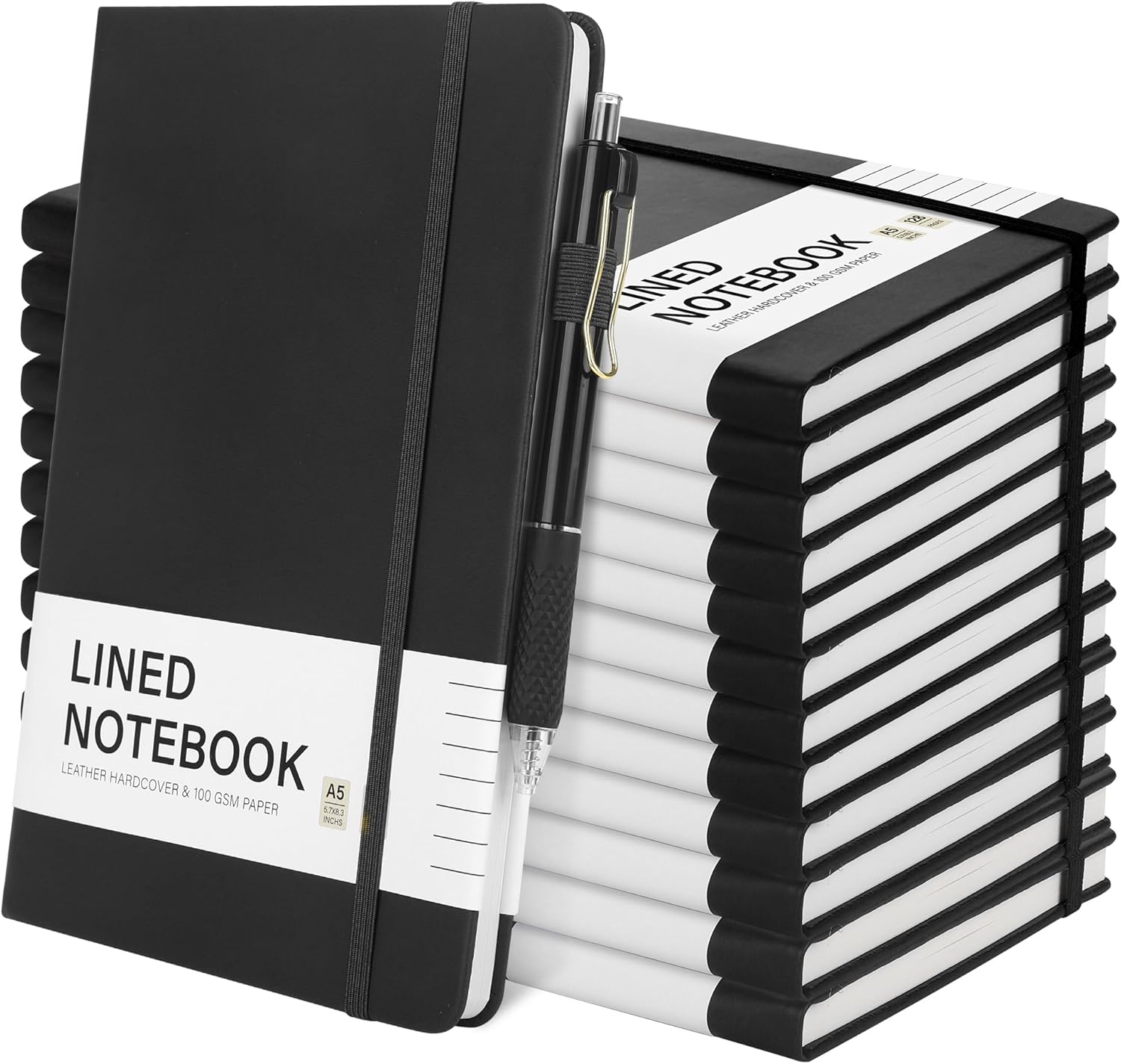 Aodaer 12 Set Lined Notebook Journals with Pens A5 Notebooks 100 GSM College Ruled Hardcover Notebook PU Leather Notepad with Pen Holder for Office School, 5.7 x 8.3 Inches, Black