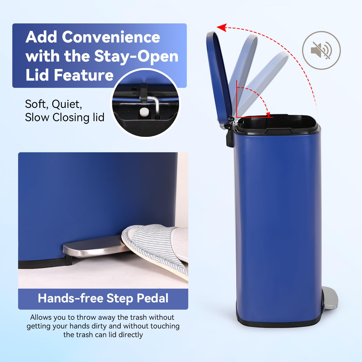 PayLessHere Stainless Steel Trash Can with Lid - Removable Inner Bucket, Foot Pedal Soft Close for Office, Home, Kitchen Garbage Bin (Deep Blue, 13 G)