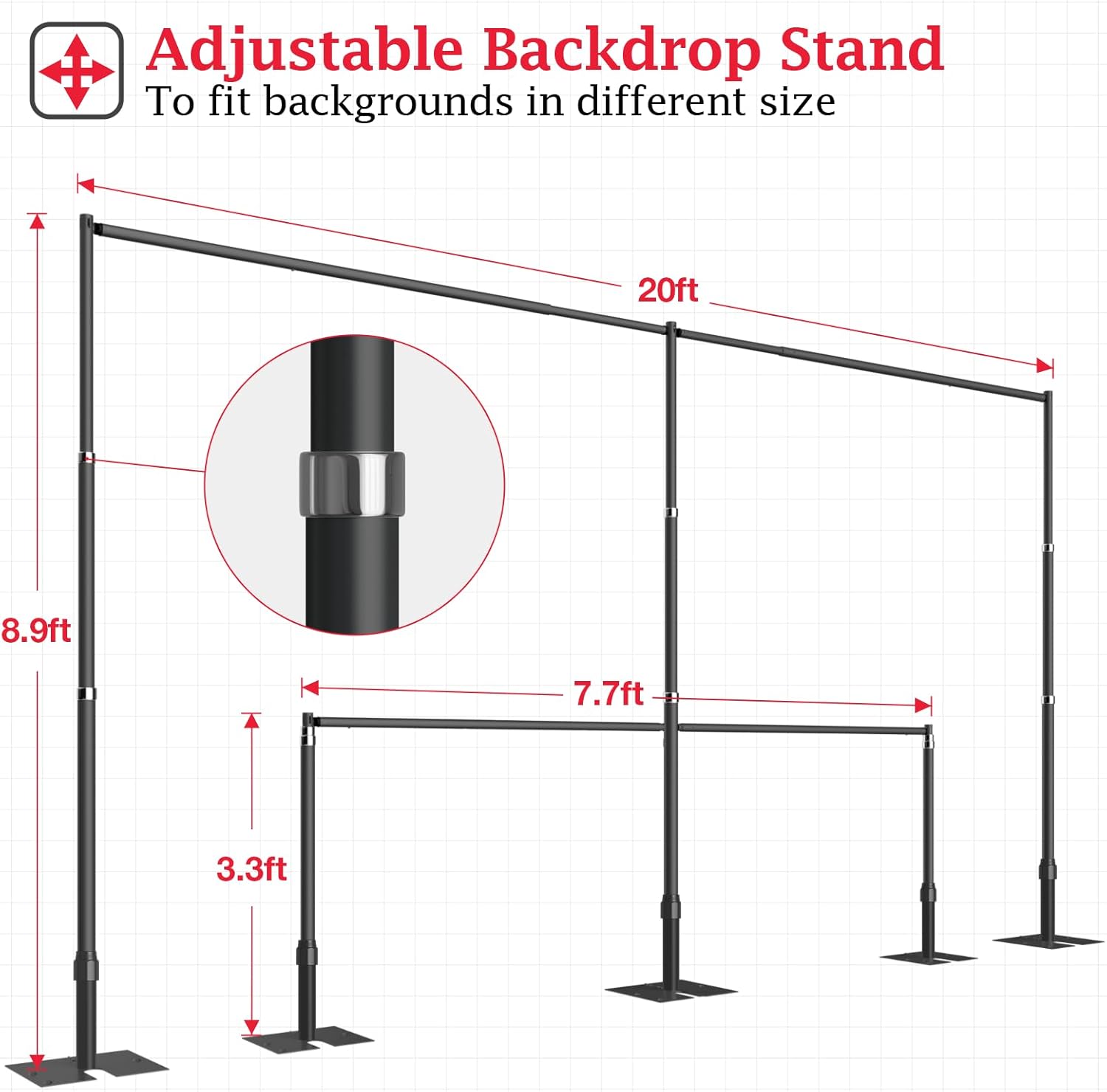 - 【Sturdy Photo Background Stand】8.9x20 ft /2.7x6 m heavy duty backdrop stand. Aluminum and steel framework provides maximum stability and professional durability,Sturdy base legs provide sturdy balanced support for safety and reliability
