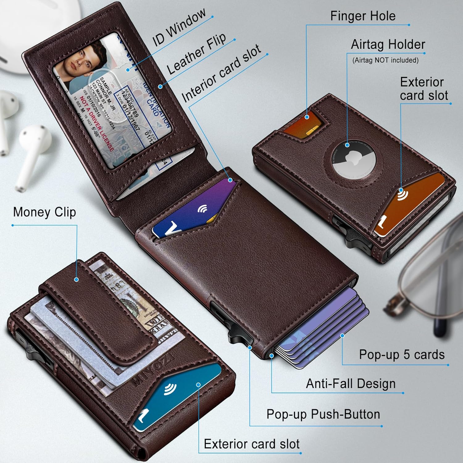 - AMPLE STORAGE--Easy for 9 cards and holds Airtag,Slim wallet with refined layout to fit in front pocket,the money clip with Leather wrapped for carry cash,5 cards in the aluminum case with pop-up access,4 cards in the leather shell;