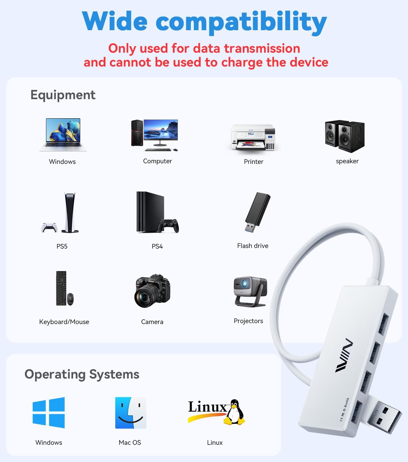 - High-Speed Data Hub: The 4-port USB distributor utilizes high-efficiency USB 3.0 to provide stable data transfers of up to 5Gbps (USB 3.0) and supports transfer speeds of 480Mbps (USB 2.0) and 12Mbps (USB 1.1).***This device is only used for data transmission and cannot be used to charge the device***