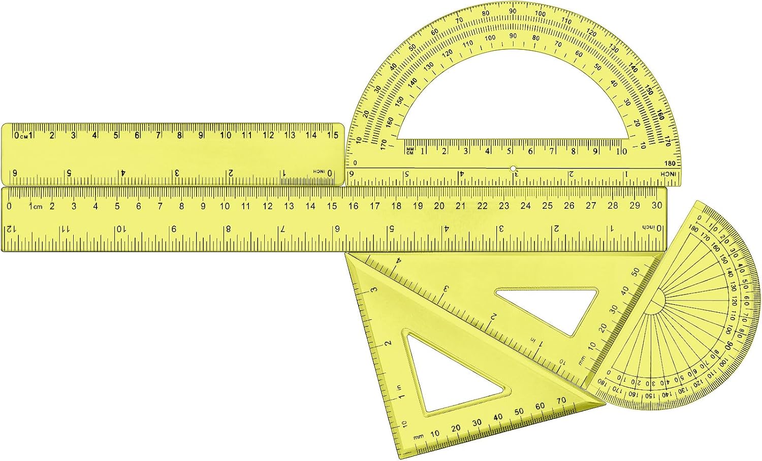Tenare 1 Set Plastic Clear Math Set Includes Protractor Triangle Rulers 12 Inch 6 Inch Straight Geometry Math Transparent Ruler Measuring Tool for School Office Home Supplies(Yellow)