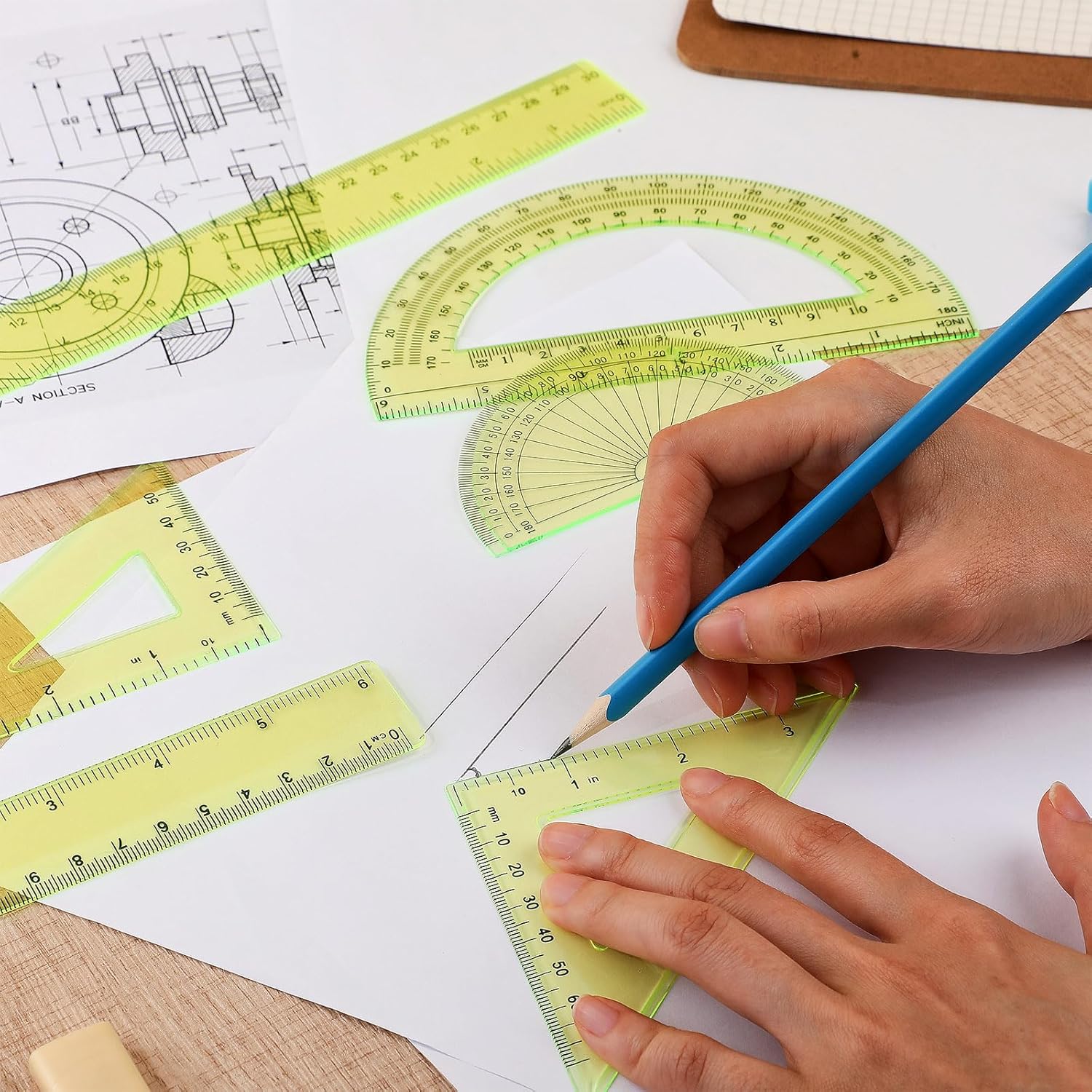 - Hollow design: the triangle ruler and hollow type protractor adopt the middle hollow design, which can better hold the ruler; Besides, there is a hole at the bottom of the hollow type protractor, which is nice for locating the point of the figure and drawing geometric figures with different angles