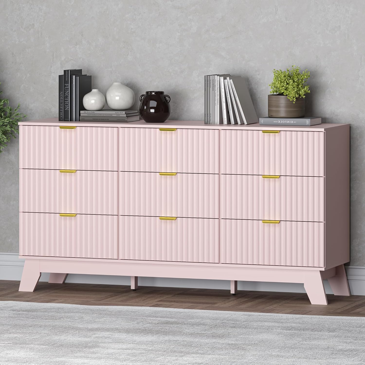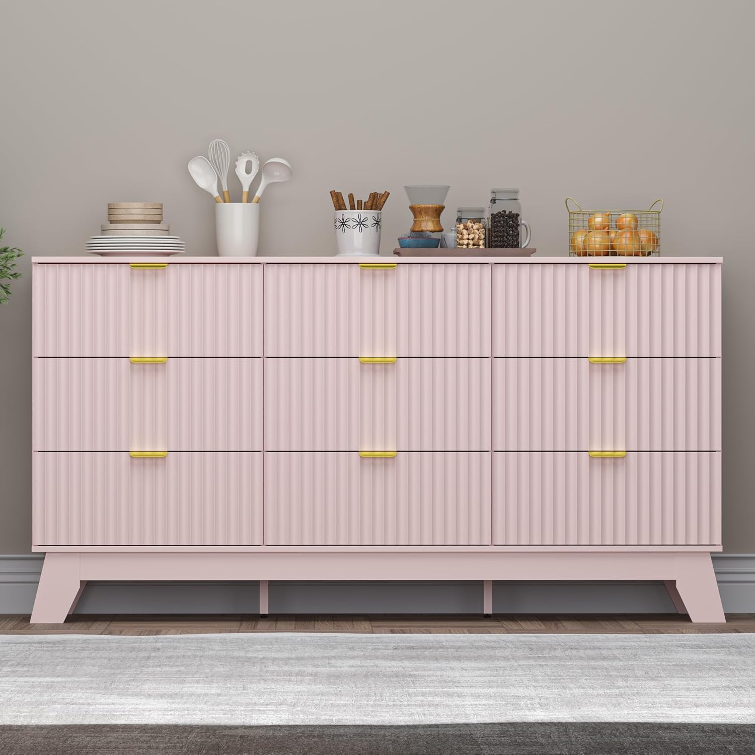 Fluted 9 Drawer Dresser, 57.1" Wide Modern Boho Chest of Drawers, Wooden Storage Dresser TV Stand for Bedroom, Living Room, Closet, Hallway, Curved Profile Design