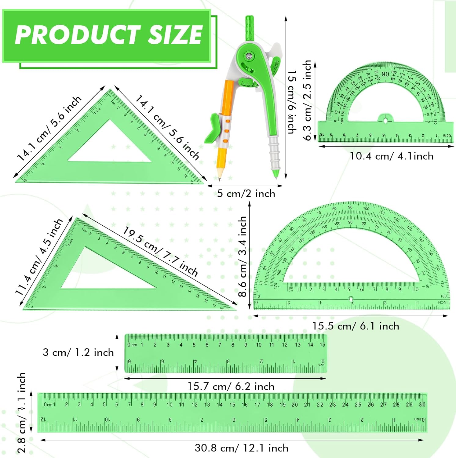 Zonon 1 Set Plastic Geometry Math Set 7 Pcs Includes 6'' / 4 '' Protractor, Drawing Compass, 45/60 Degree Triangle Rulers, 12'' / 6'' Math Ruler Transparent for Office Supplies(Green)