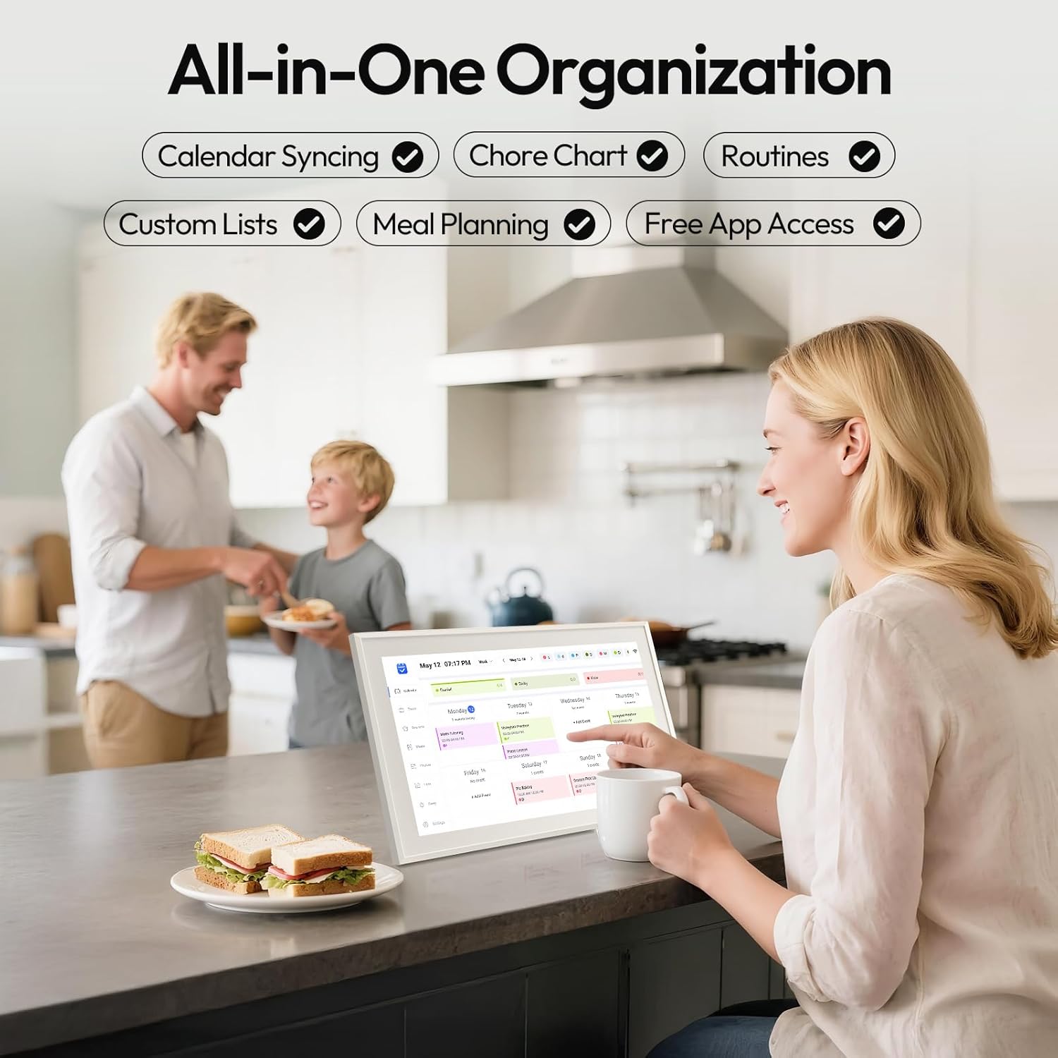 - [Interactive Chores Chart & Dinner Planner] Our digital calendar keeps housework organized and motivates family members, especially children, to develop healthy habits with an interactive chore chart. Display your family dinner plans to keep everyone informed and eliminate the daily "What's for dinner?" question.