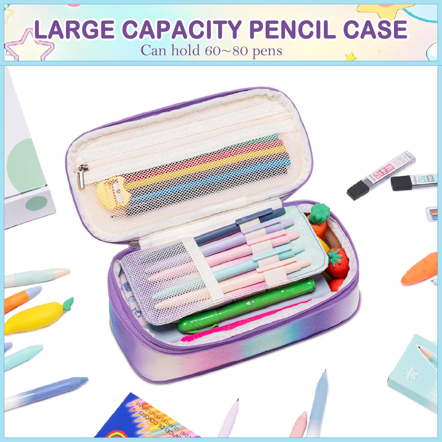 - 【CUTE PENCIL CASE - SMART STORAGE DESIGN】: The spacious pencil bag stores all your study tools in one place. Made from sturdy materials with secure zipper closure, it's for home, church, or school use. Features a mesh pocket for quick-grab items and a dedicated middle compartment that holds 5 favorite pens separately, while the main compartment stores all other supplies in one convenient space. The clever layout keeps essentials visible and within reach without requiring perfect organization - ideal for busy students, artists, and professionals on-the-go