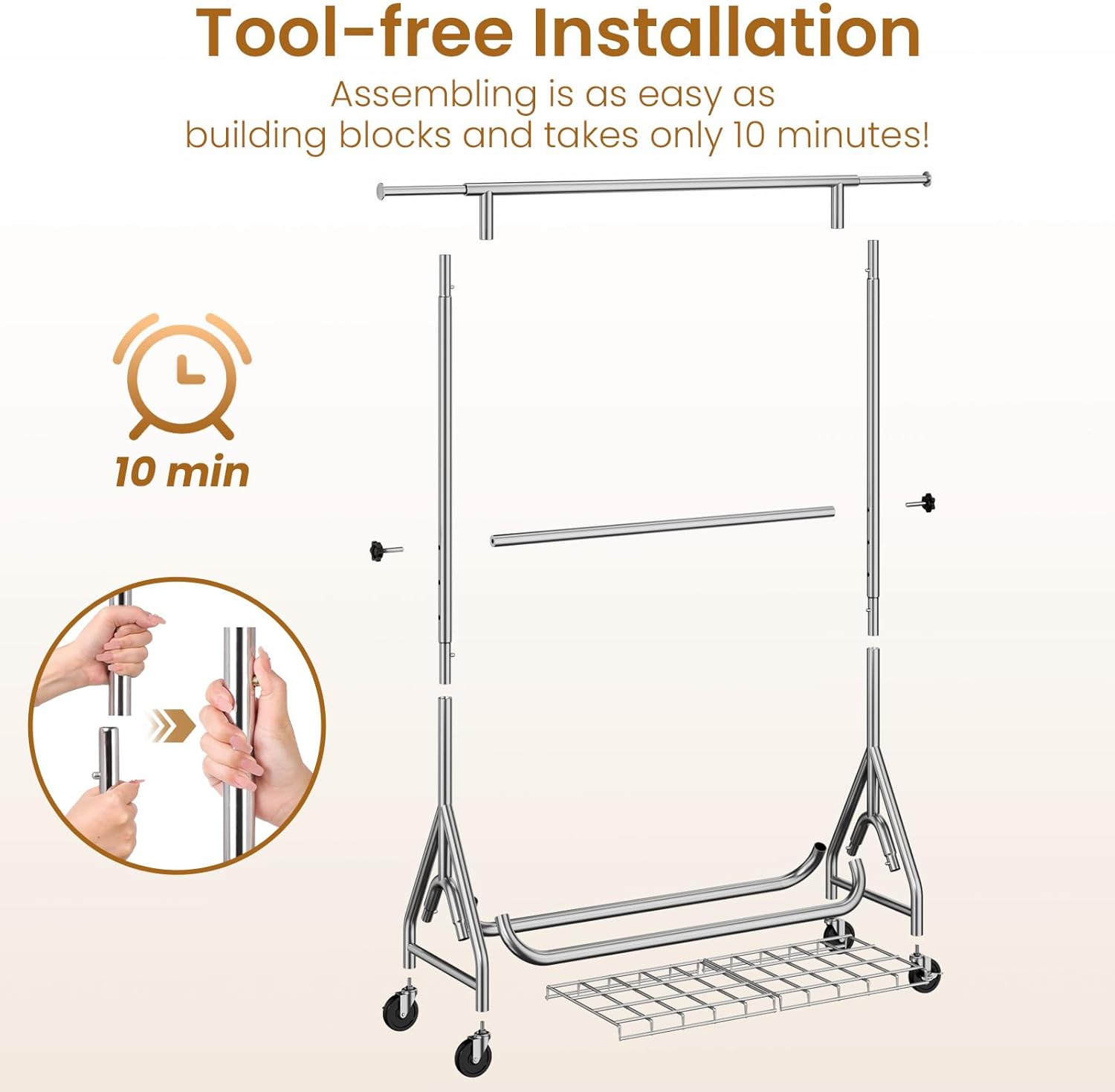 - ๐ณ๐ด ๐๐ฃ๐๐๐๐จ ๐๐ญ๐ฉ๐ง๐ ๐๐๐๐ ๐ฟ๐๐จ๐๐๐ฃ: Say goodbye to folded hems and floor-dusty garments! Our rolling garment rack's 78-inch height comfortably accommodates maxi dresses, long coats, and formal gowns without any dragging. Finally keep your favorite outfits pristine and off the ground.