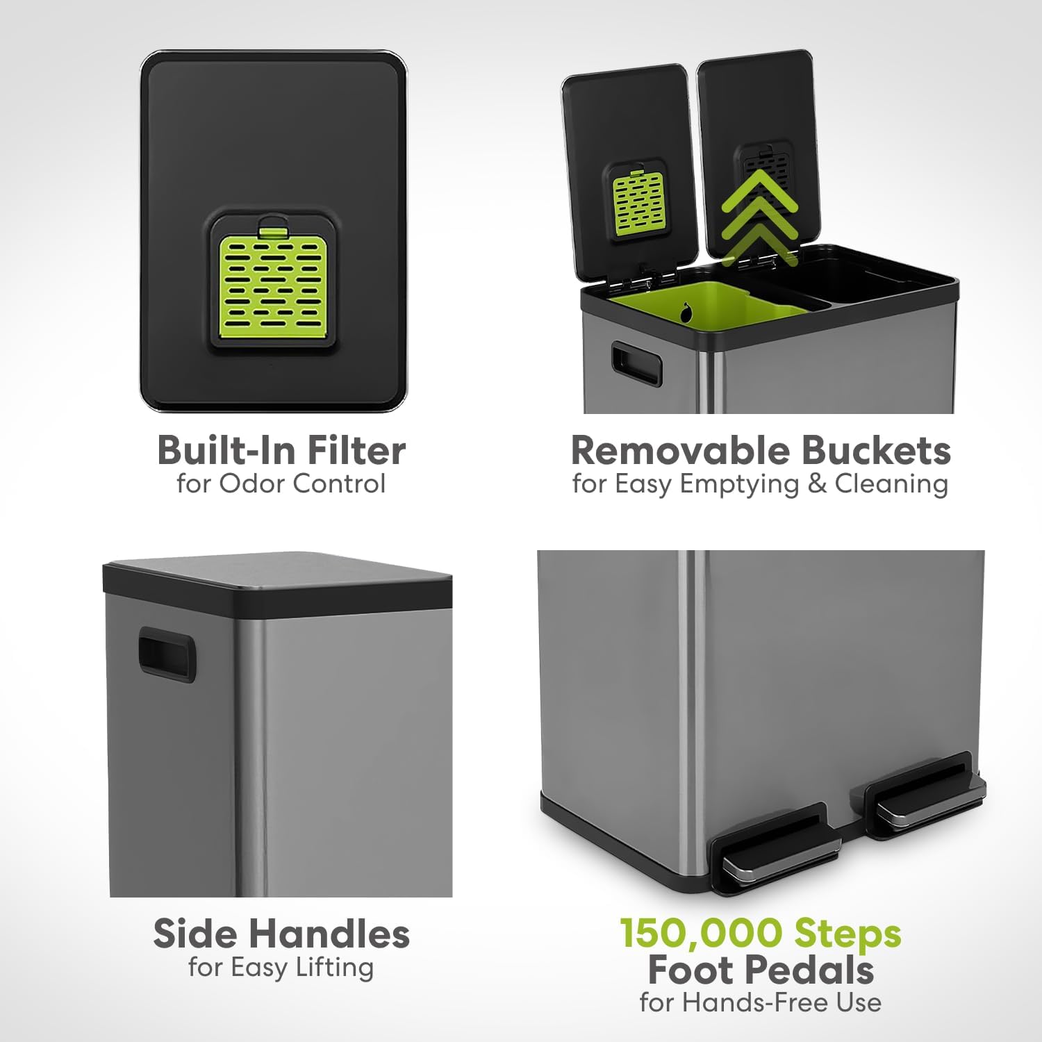 - HANDS-FREE USE: The stainless-steel foot pedal stands up to daily use and removes the need to touch the lid during waste or recycling disposal to keep hands clean.