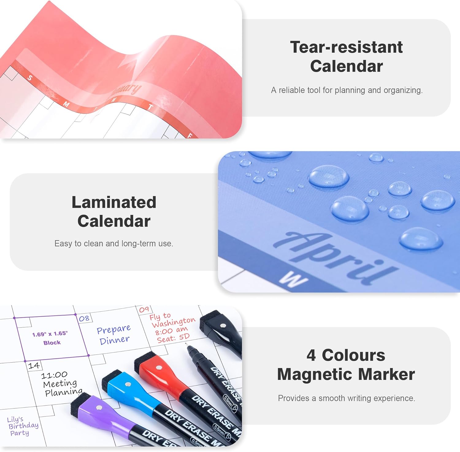 - ✨ Dry Erase Wall Calendar : is made of PET Film and 300 grams Copperplate Paper, providing a durable surface that resists scratches and smudges, while the sturdy Copperplate Paper backing keeps it in place without curling.