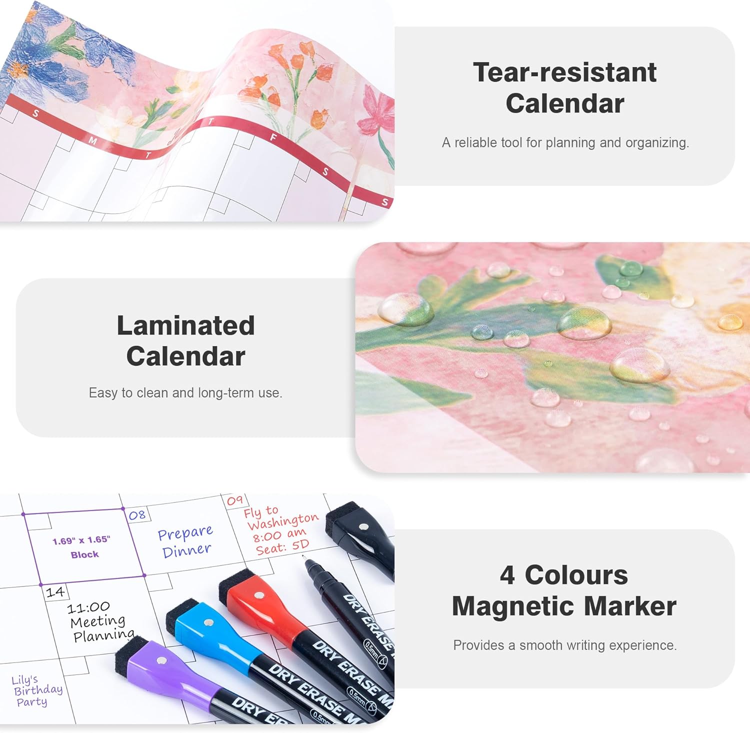 - ✨ Dry Erase Wall Calendar : is made of PET Film and 300 grams Copperplate Paper, providing a durable surface that resists scratches and smudges, while the sturdy Copperplate Paper backing keeps it in place without curling.