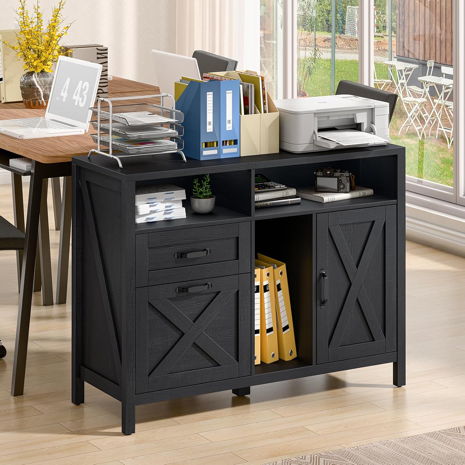 Lateral File Cabinet with 2 Drawers and Door, Farmhouse File Cabinet for A4/Letter Size Hanging Files, Large Wood File Storage Cabinets Printer Stand with Open Space for Home Office Furniture, Black