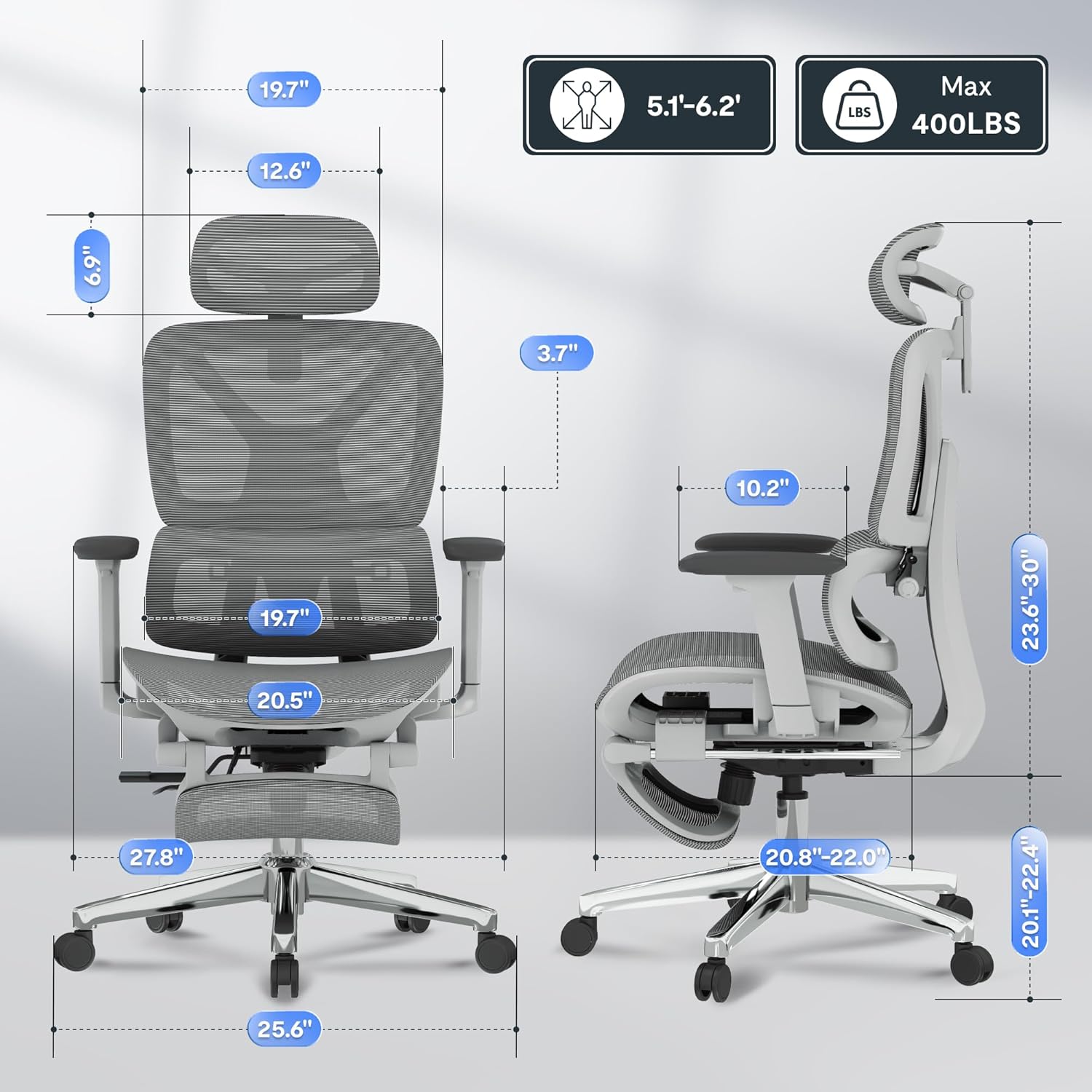 - Enhanced Ergonomics: Dynamic lumbar support, 5-level adjustable back, a 3D adjustable headrest, nap footrest and tilt provide superior back and neck support for long hours.