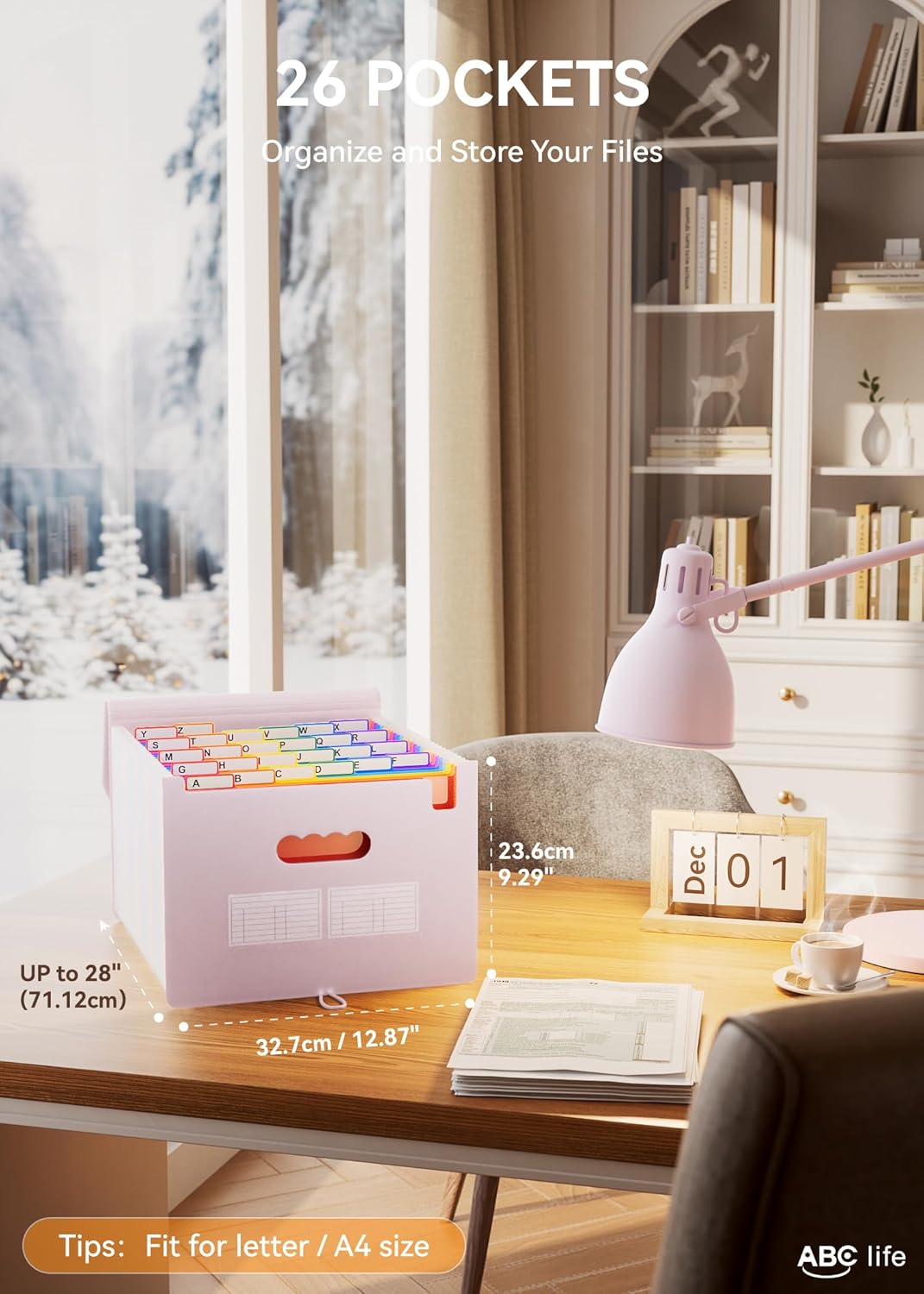 - 26 Expanding File Folder: ABC life pockets accordian file organizer suitable for filing tax and storing important family documents. Product size is 13 "x 9.4"x 28", top and bottom are both expandable, For letter/A4 size files.