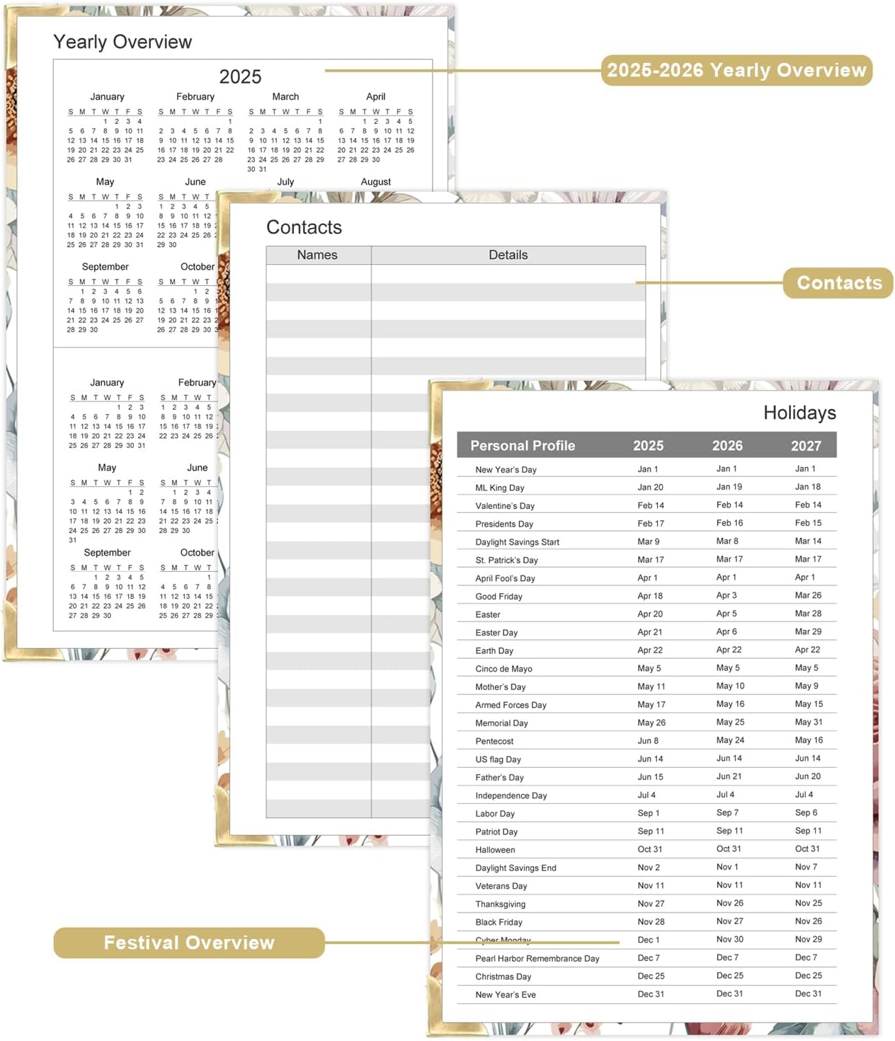 - 224 SHEETS / 448 PAGES - This undated planner measures 5.8 x 8.5 inches, a comfortable size for daily use and carrying. The planner notebook includes a Yearly Overview, Personal Information, Contacts, Important Dates, Monthly Pages, Daily Pages, Notes Pages, and a festival overview page covering 2025-2027. It comprehensively contains everything needed for daily use.