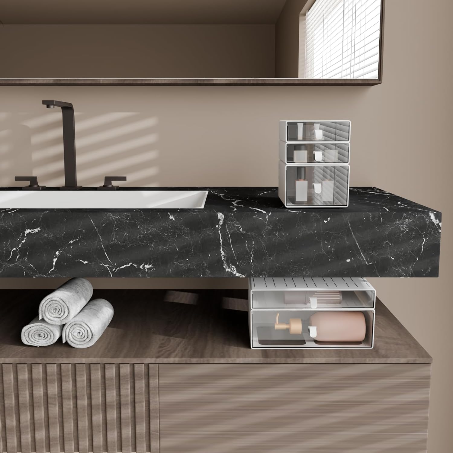 - Various Sizes: The set comes with 5 storage drawers in 4 distinct sizes. includes: 7.1*5.6*1.9 inches (2 pcs), 7.1*5.6*3.7 inches (1 pcs), 7.1*11.1*1.9 inches (1 pcs), 7.1*11.1*3.7 inches (1 pcs). This variety allows for customized storage, Fits on most dressers, desk, bathroom vanity desks, and counter tops.