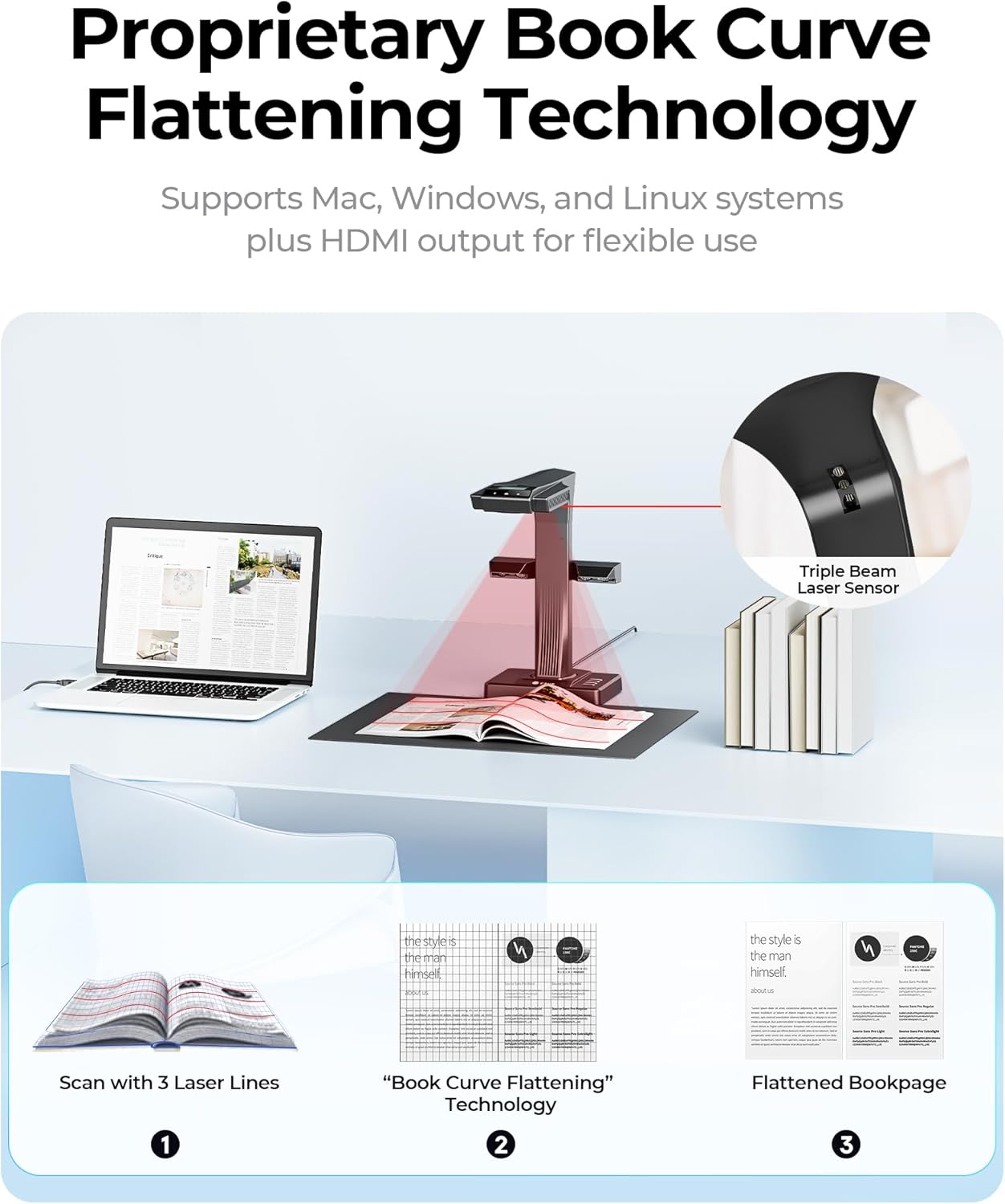 - Patented Curve-Flattening Technology: Automatically flattens the curved pages of bound books and removes distortion for accurate, clean scans without the need to unbind