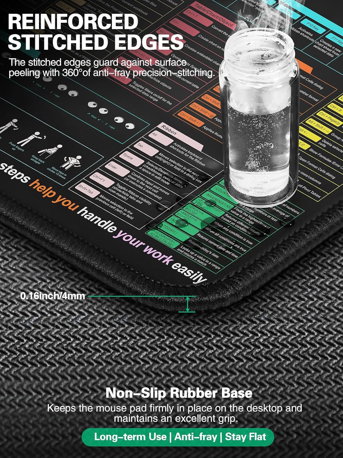 - Massive Size & Excel/Word/PowerPoint/Windows Shortcuts: Dominate your workspace with a huge 31.5" L x 15.75" W surface, providing ample room for your mouse, keyboard, and monitor. The premium print of essential Excel/Word/PowerPoint/Windows keyboard shortcuts is a game-changer for professionals, students, and gamers, boosting productivity and workflow efficiency right at your fingertips.