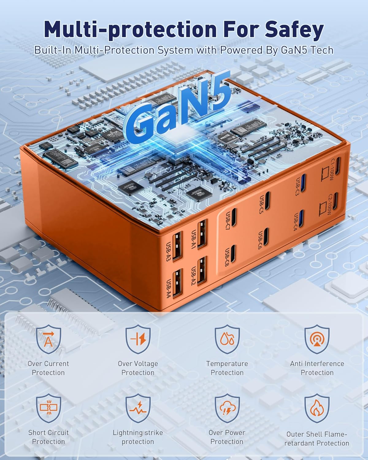 - 【12-in-1 USB C Charging Station】This 600W USB C Charger Block comes with 8 USB C ports and 4 USB A ports to charge multiple devices, simplify your charging setup, and let you experience the convenience of ultra-fast and ultra-high output charging. With its smart charging technology, it can automatically detect and provide the best power output for each connected device, ensuring fast and efficient charging.