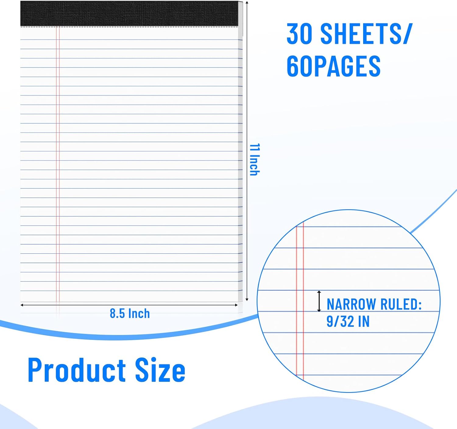 - PRODUCT SIZE AND NUMBER OF PAGES: Sufficient number of pages (30 sheets per pack,12 packs ,total of 360Sheets), Spacing 7MM line of notepads (Narrow-Ruled: 9/32 Inch), convenient of size (8.5x11inch), and 8.5x11 inch size makes it versatile and can be used to create reminders, to-do lists and notes.
