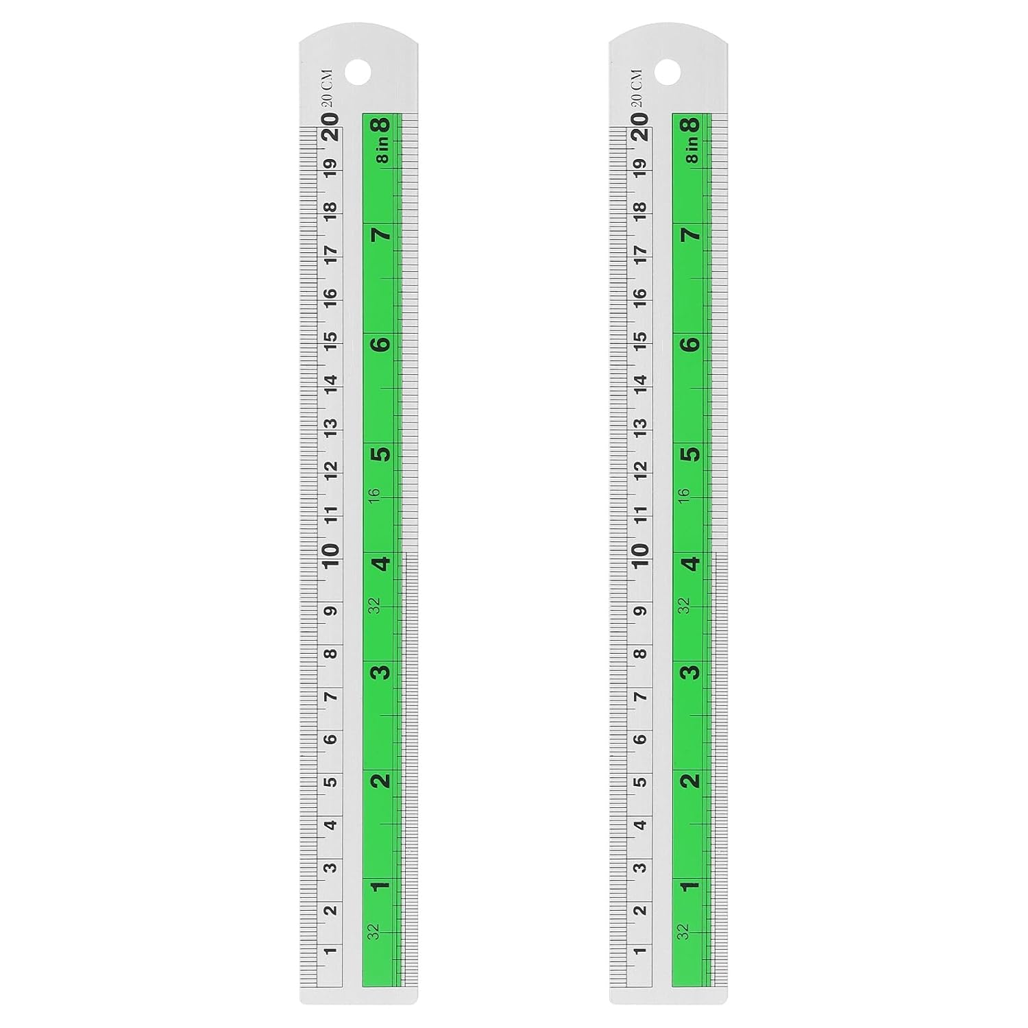 HARFINGTON 2pcs Metal Straight Ruler 20cm Metric SAE Aluminum Alloy Measuring Rulers Scale Tool with Hole for Measure Study Reading Classroom Office, Green