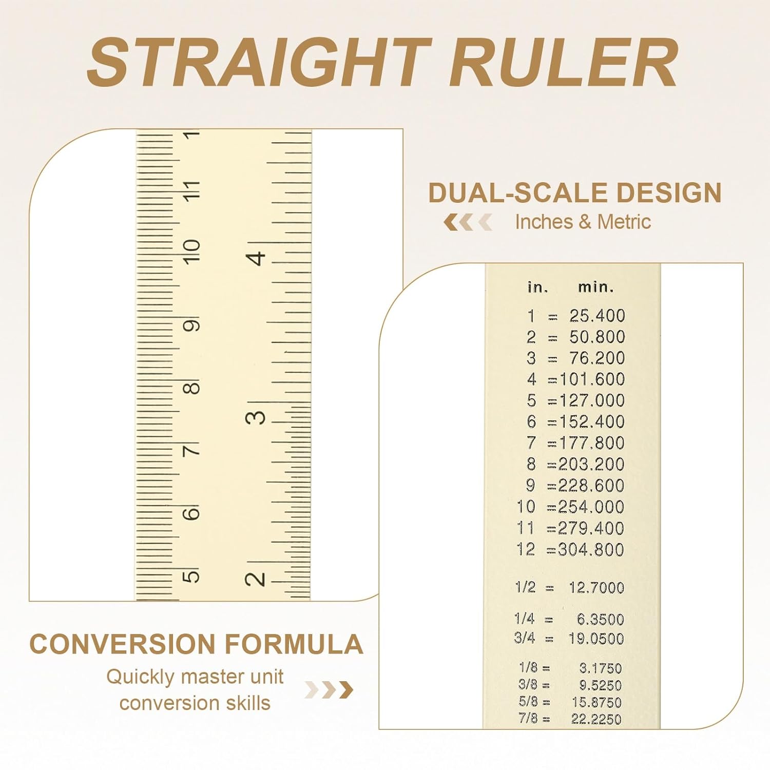 - Feature - The ruler features ink printing technology on its surface, ensuring that the scale is clear and sharp, remaining non-fading and non-blurring even after long-term use. It has a dual-scale design, and the back is carefully printed with a complete set of conversion formula for metric and SAE units, allowing beginners to quickly master unit conversion skills. Additionally, it includes a hanging hole design for convenient storage and accessibility.