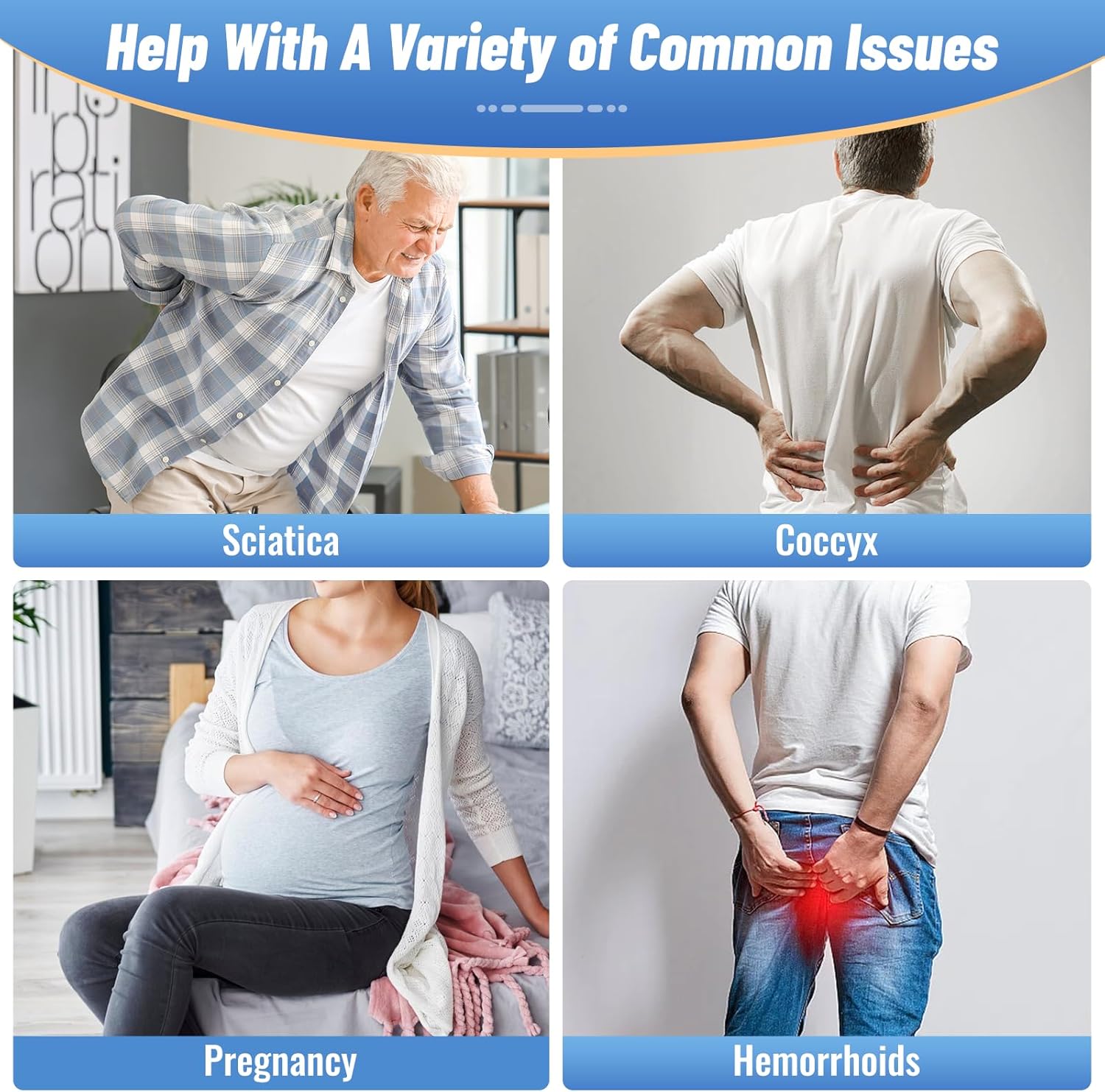 - Ergonomic Design: CloudBliss tailbone pain relief seat cushion features an ergonomic "U" shaped gap and center hole that evenly distributes weight, reducing hip pressure when in use and effectively reducing pressure on the tailbone, thus alleviating hemorrhoidal pain and relieving discomfort caused by sitting for long periods of time. Ideal for pregnant women, post-surgery recoveries, office workers and more