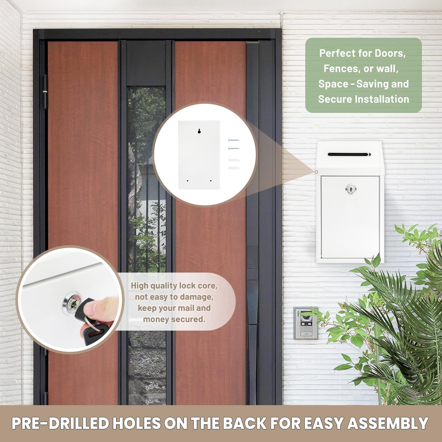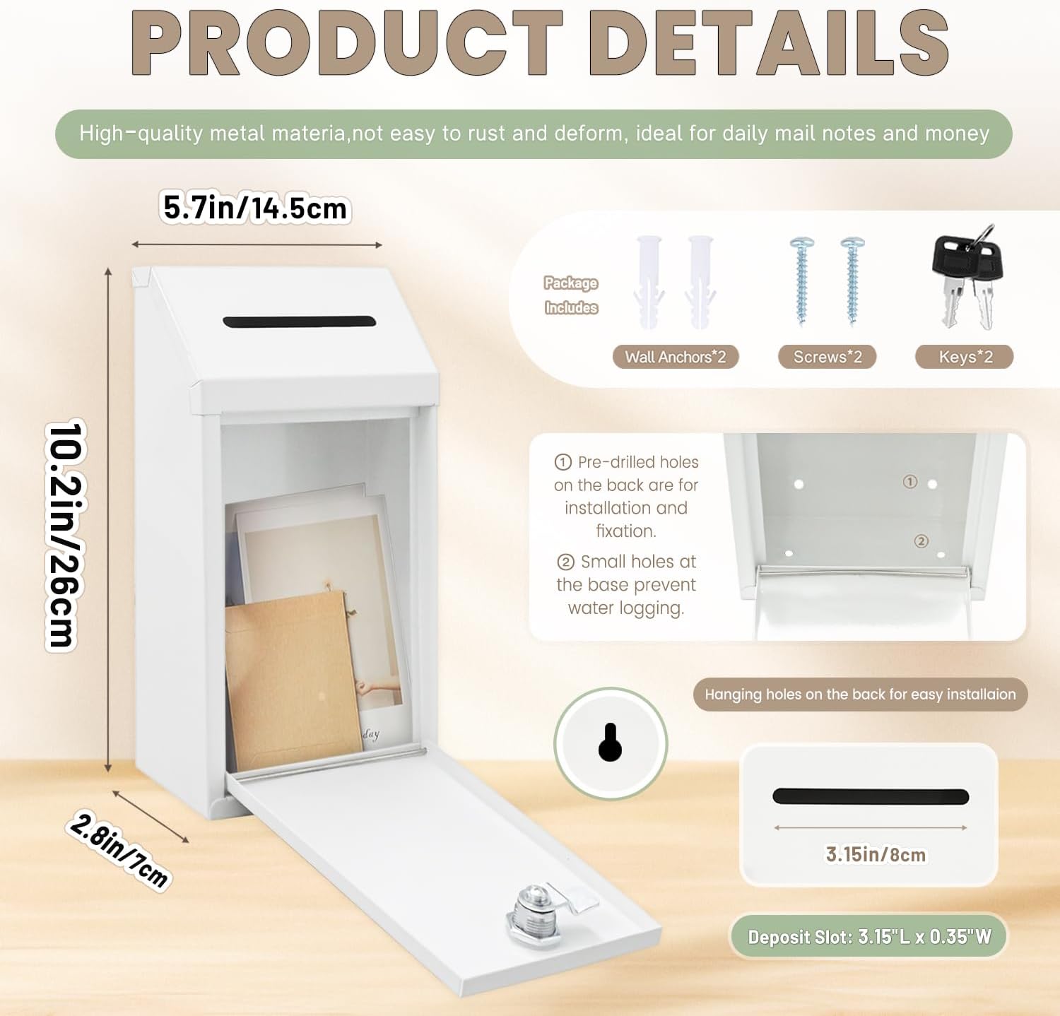 Metal Donation Money Cash Drop Box with Lock and Slot Suggestion Box Wall Mounted Ballot Container Mailbox Delivery for Home Office (White, 10.24″ x 5.71″ x 2.95″)