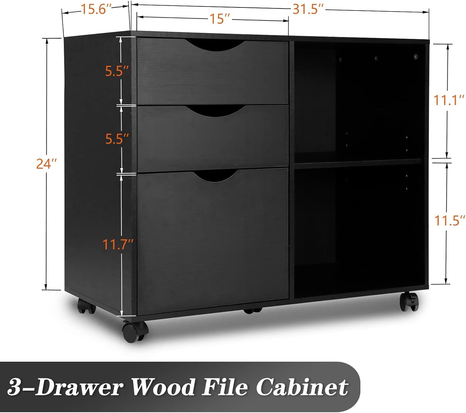 QDSSDECO 3-Drawer with Shelf Wood File Cabinet Mobile Lateral Filing Cabinet, with Rolling Wheel Printer Stand and Open Adjustable Storage Shelves, for Home Office, Black