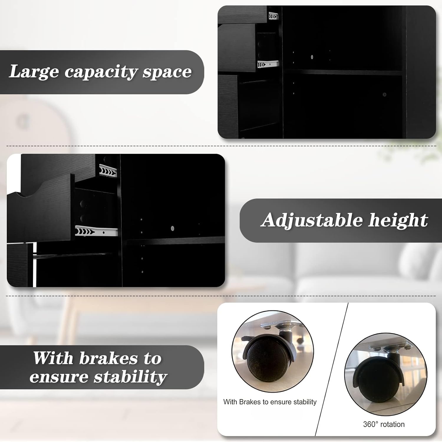 - EASY TO MOVE: The filing cabinet is equipped with four rollers, which can be rotated 360°, and the rollers have fixed brakes to prevent the file cabinet from sliding
