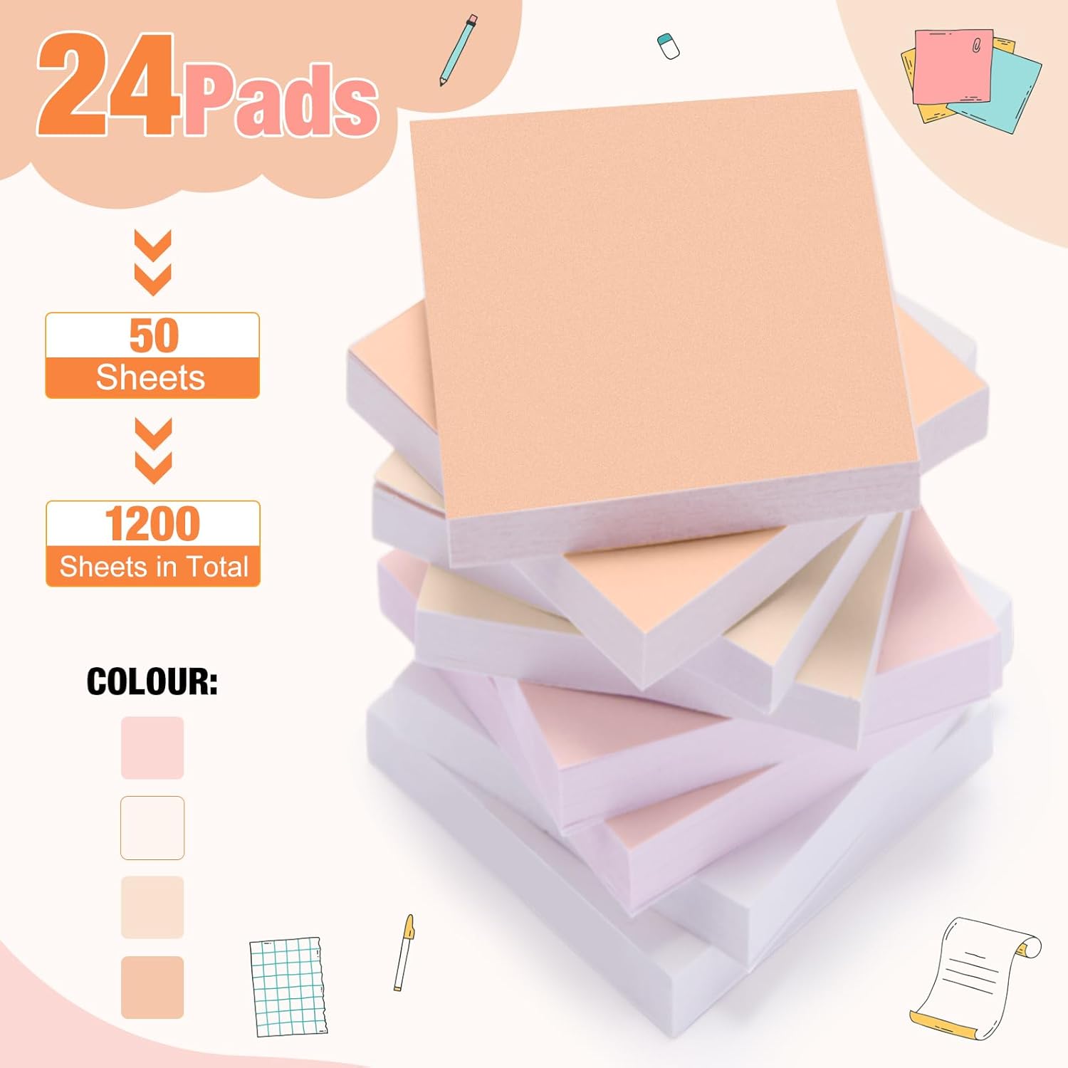 - Package Includes: you will receive 24 packs of sticky notes in 4 colors, 6 packs each color, 50 pieces for each pack, 1200 sheet in total, the size of each self sticky note is about 2 x 2 inches; Sufficient quantity can meet your daily use and replacements, and you can share them with your friends and colleagues