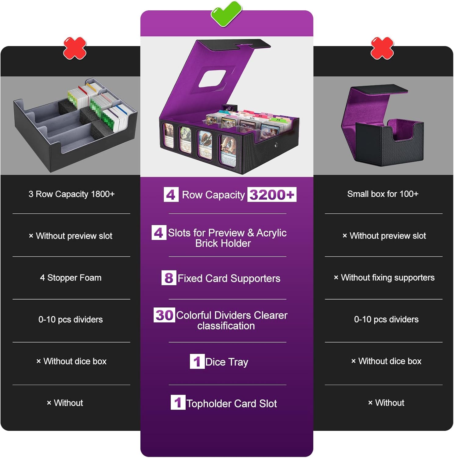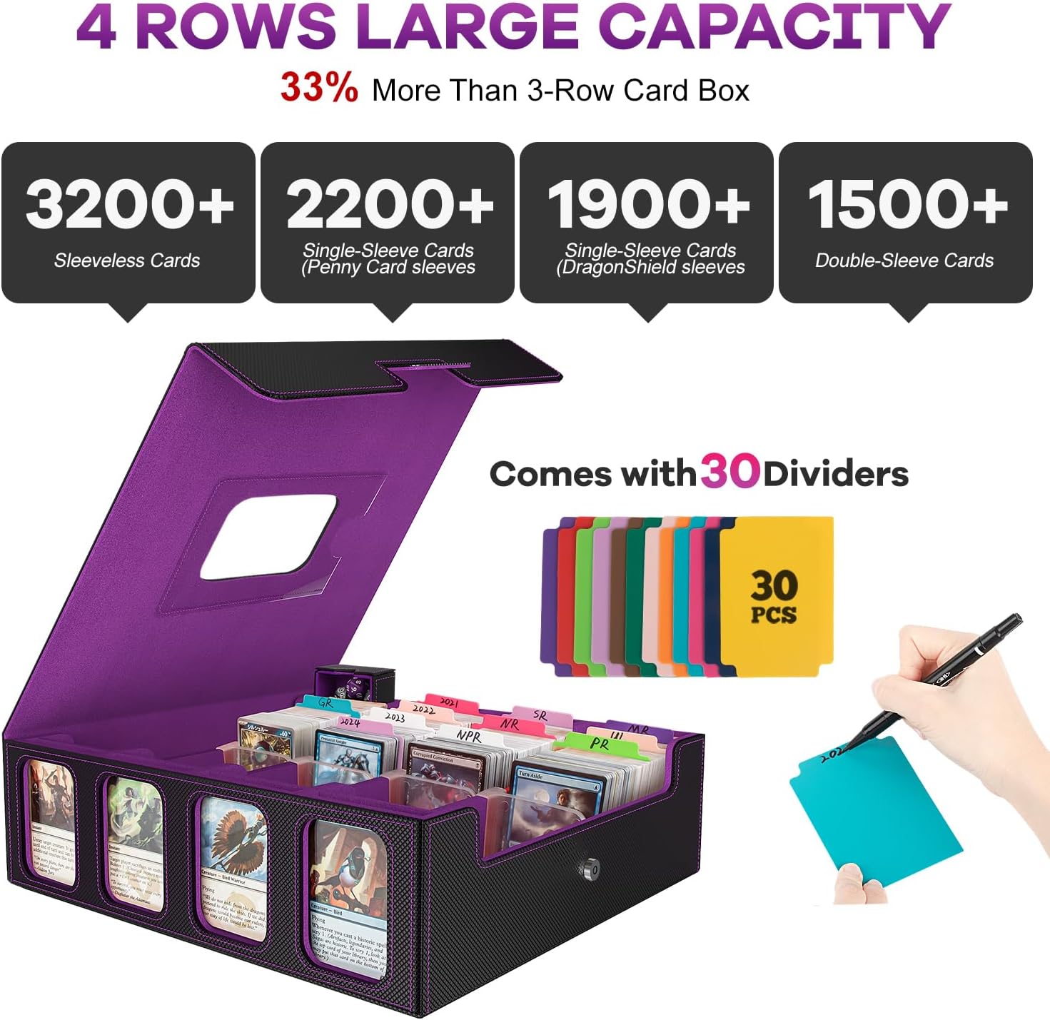 Trading Card Storage Box - 3200+ MTG Deck Box with Commander Display & Portable Handle, 4-Row Card Case Compatible for MTG/TCG/Magic Cards, 30 Colorful Divider, 8 Card Supporters (Black & Purple)