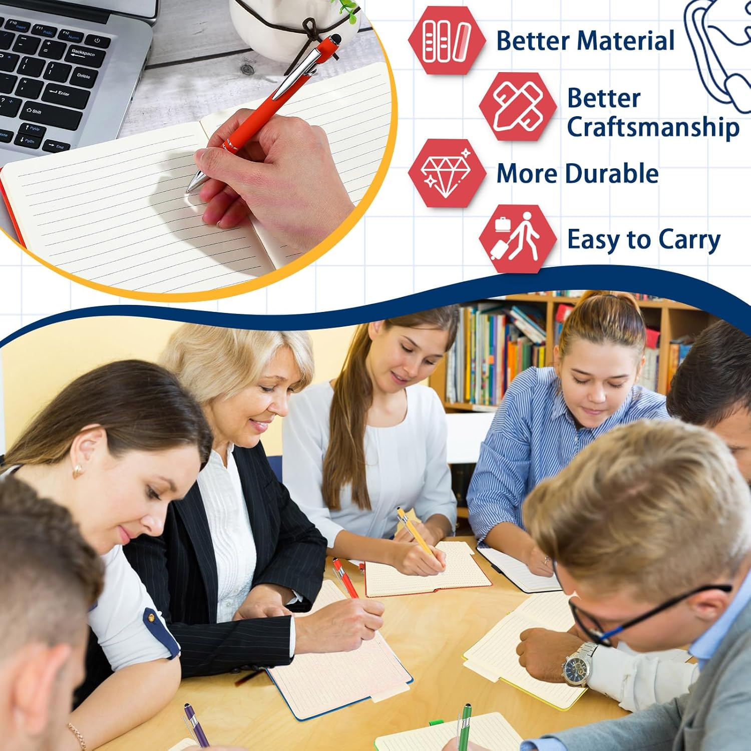 - Retractable Pens: these pens fit into the pen holder of the classic lined notebook; The large tube has the ability to hold more ink, making them long lasting and quick dry, which can avoid smudging, and the other end of the pen can touch the screen