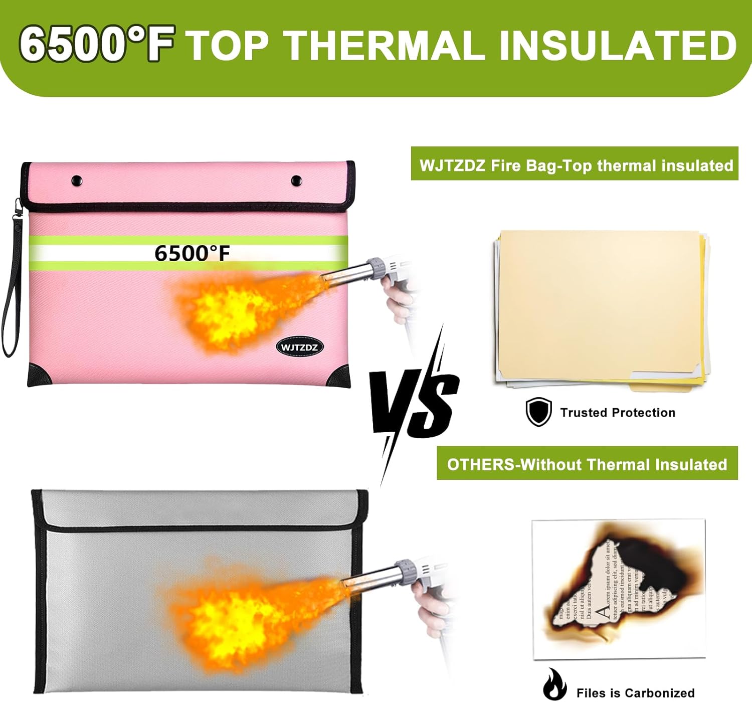- ⚠️(Note) Fireproof does not mean it can withstand a long fire, and waterproof does not mean it can be immersed in water for a long time.It just gives you enough time to rescue your valuables. 🔥【6500°F Top Fireproof】The upgraded fireproof bag has passed the global flammability standard (US laboratory) and vertical burning test (SGS UL94 V-1) and can withstand temperatures up to 6500°F, far exceeding the typical fire temperature.
