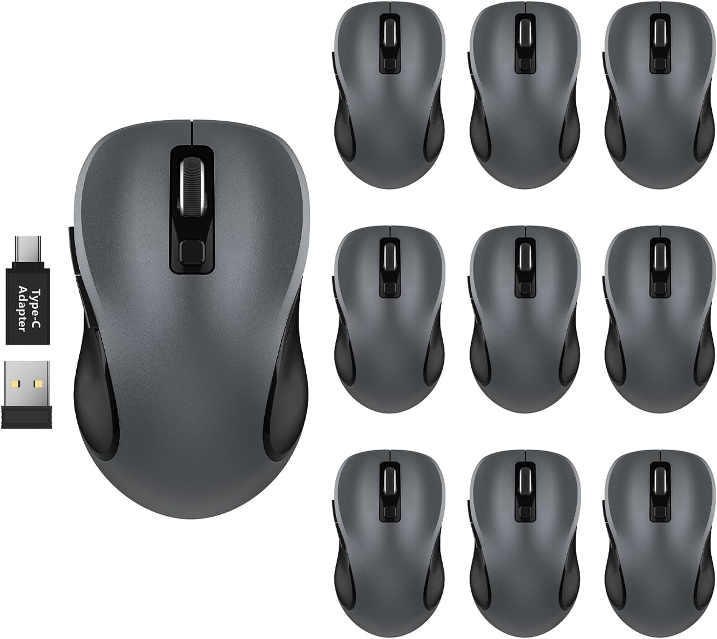 WisFox 2.4G Wireless Mouse for Laptop, Ergonomic Computer Mouse with USB Receiver and Type-C Adapter, 3 Adjustable Levels DPI, 6 Button Cordless Wireless Mice (Grey, 10 Pack)