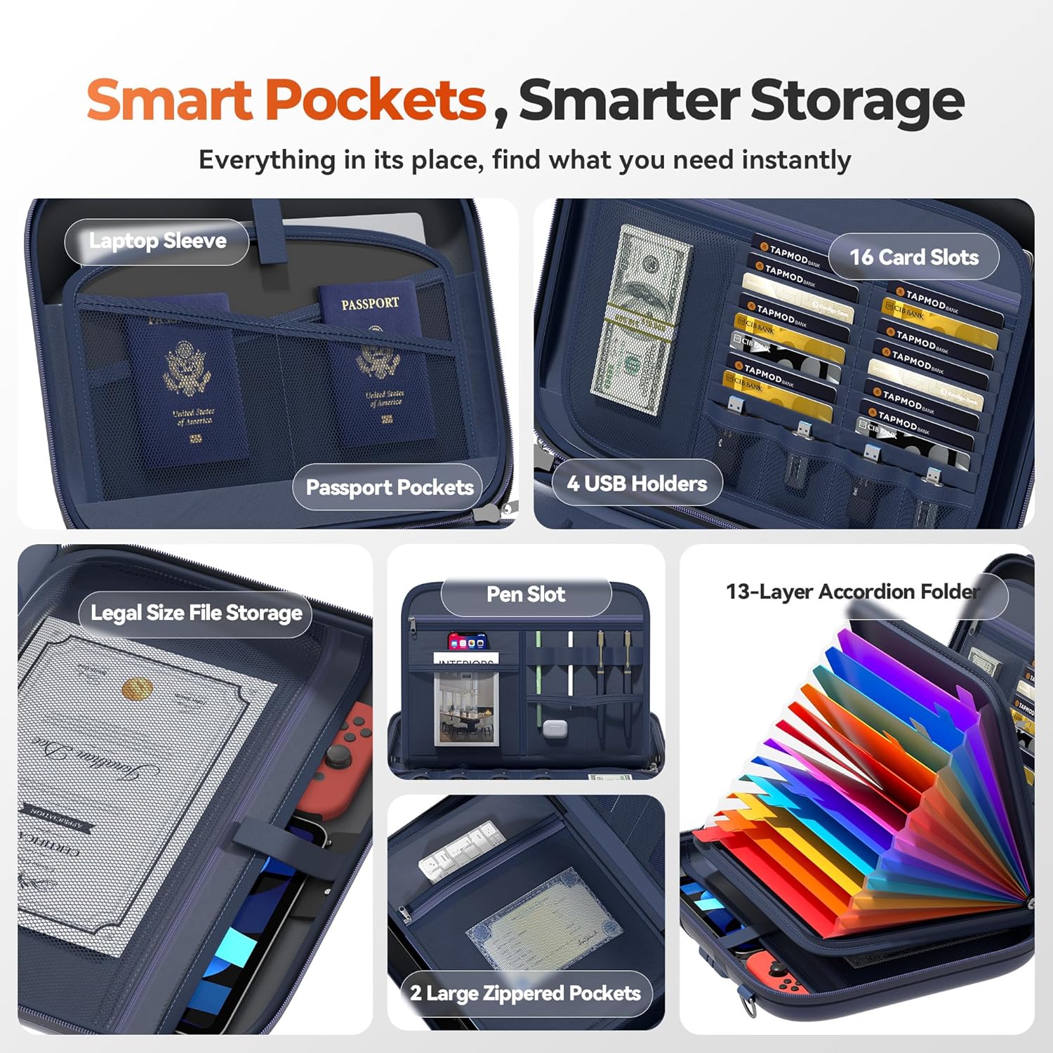 - 【Spacious Multi-Pocket Storage】: With dimensions 15.4 x 11.8 x 3.4 in (full load 14.5 x 10.7 x 4 in), our fireproof box provides generous capacity without sacrificing portability. It features a 13-pocket accordion file folder with labels, compartments for passports, cards, pens, U-disks, and a 15.6" laptop section. Enjoy the confidence of having your essential documents and valuables safely organized, and ready whenever you need them—at home or while traveling.